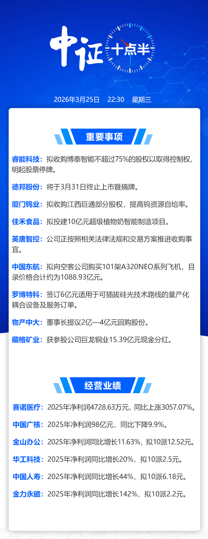 【中证十点半】德邦股份3月31日终止上市;睿能科技明起停牌
