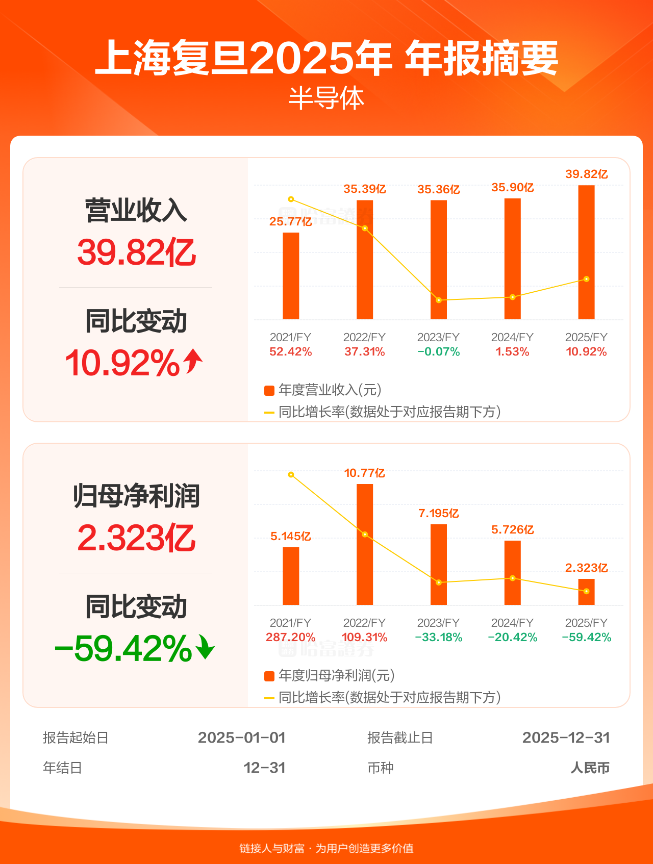 上海复旦3月27日发布年报业绩,截至2025年12月31日的12个月内,该公司营业收入39.82亿人民币,同比增长10.92%;公司权益持有人应占溢利(归母净利润)2.32亿人民币,同比减少59.42%,低于机构一致预测的9.98亿人民币。