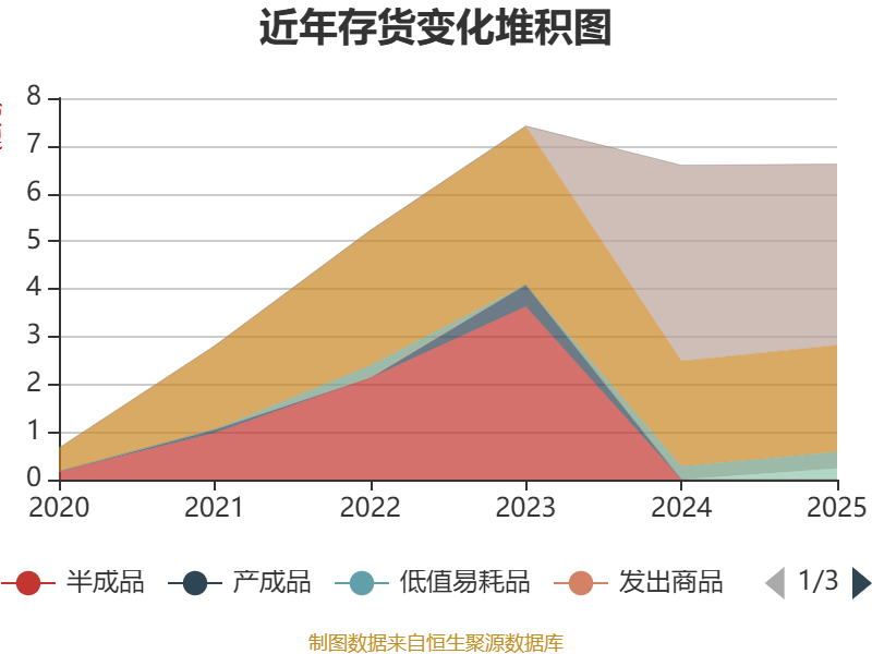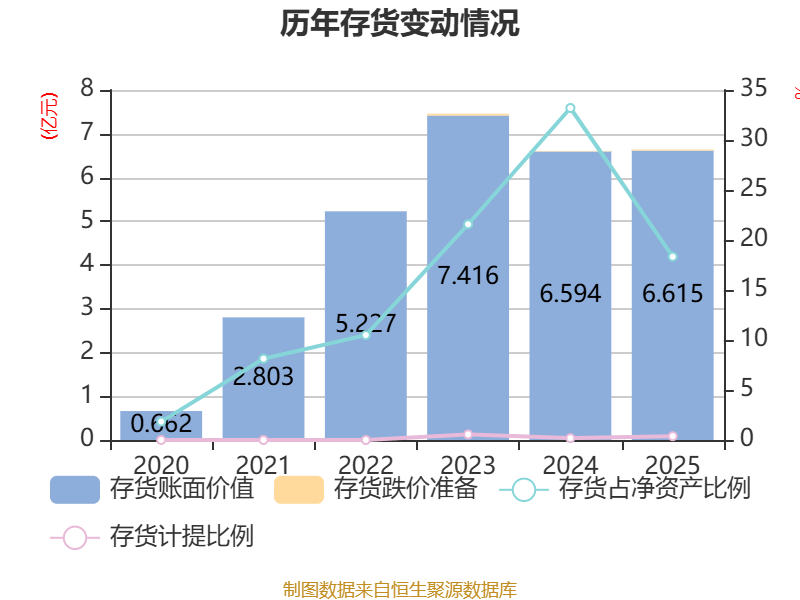 从存货变动来看,截至2025年末,公司存货账面价值为6.61亿元,占净资产的18.33%,较上年末增加211.67万元。其中,存货跌价准备为255.46万元,计提比例为0.38%。