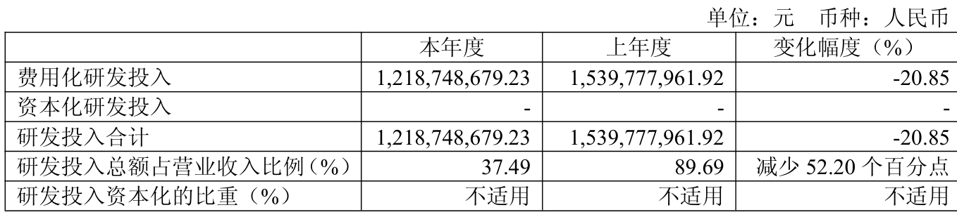 2025年全年,公司研发投入金额为12.19亿元,同比下降20.85%;研发投入占营业收入比例为37.49%,相比上年同期下降52.2个百分点。