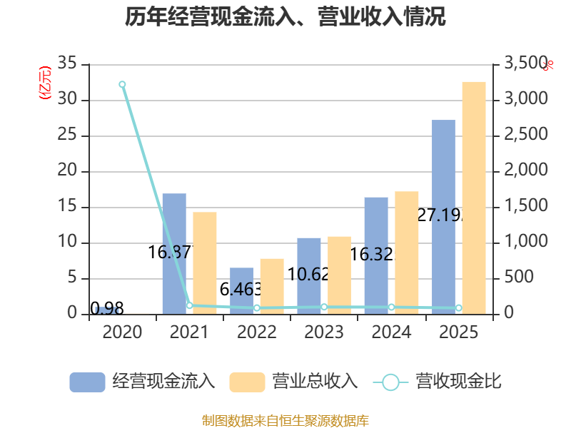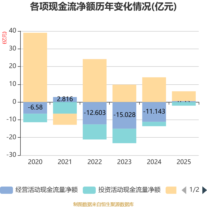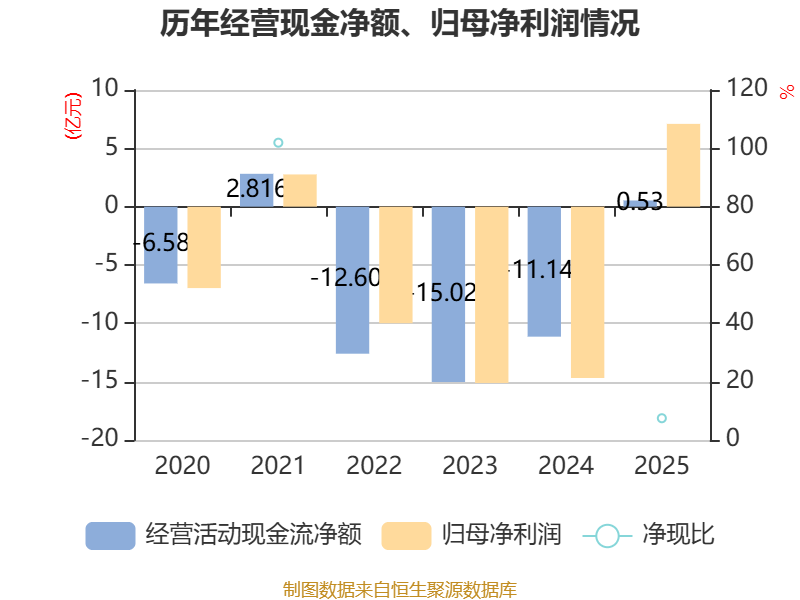 截至2025年,公司经营活动现金流净额为5295.19万元,同比增加11.67亿元;筹资活动现金流净额5.52亿元,同比减少8.41亿元;投资活动现金流净额-2.06亿元,上年同期为-2.48亿元。