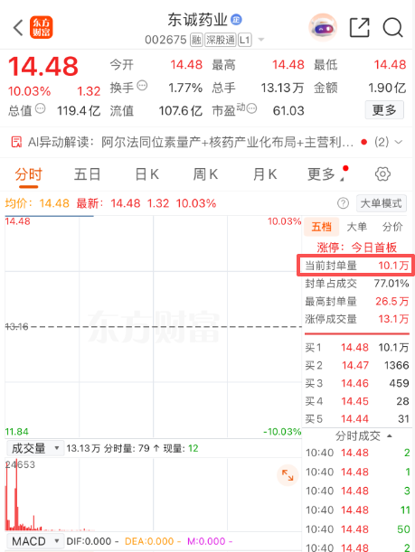 3月30日早盘,精准医疗概念反复活跃,截至10:40发稿,东诚药业一字涨停,封单仍有10.1万手,叠加两岸融合概念的海峡创新一度涨超10%,塞力医疗华邦健康基蛋生物等多股跟涨。