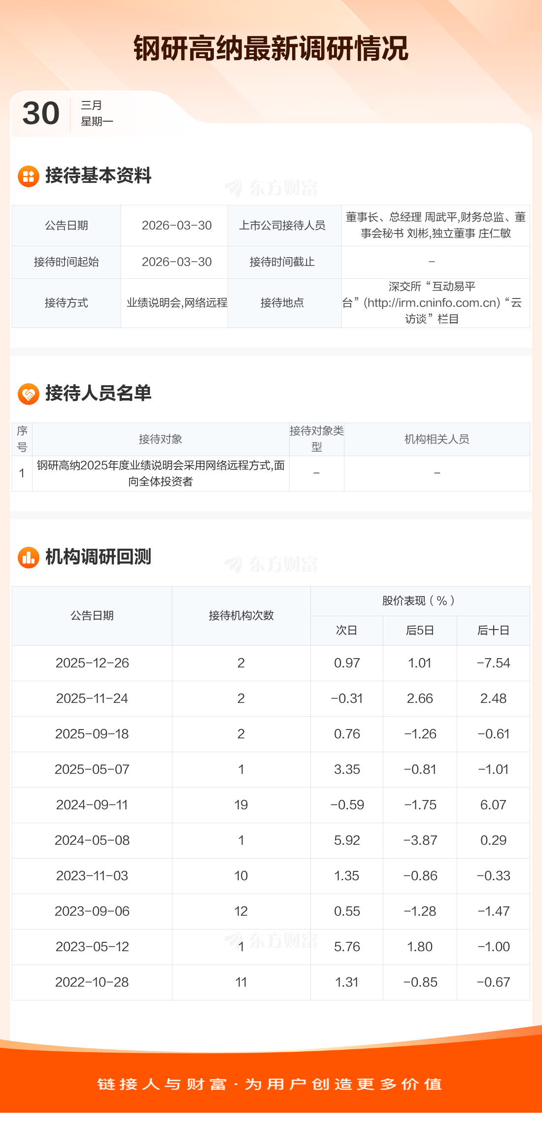 钢研高纳3月30日公告称,3月30日接待钢研高纳2025年度业绩说明会采用网络远程方式,面向全体投资者等1家机构调研。接待人员包括董事长、总经理 周武平,财务总监、董事会秘书 刘彬,独立董事 庄仁敏。