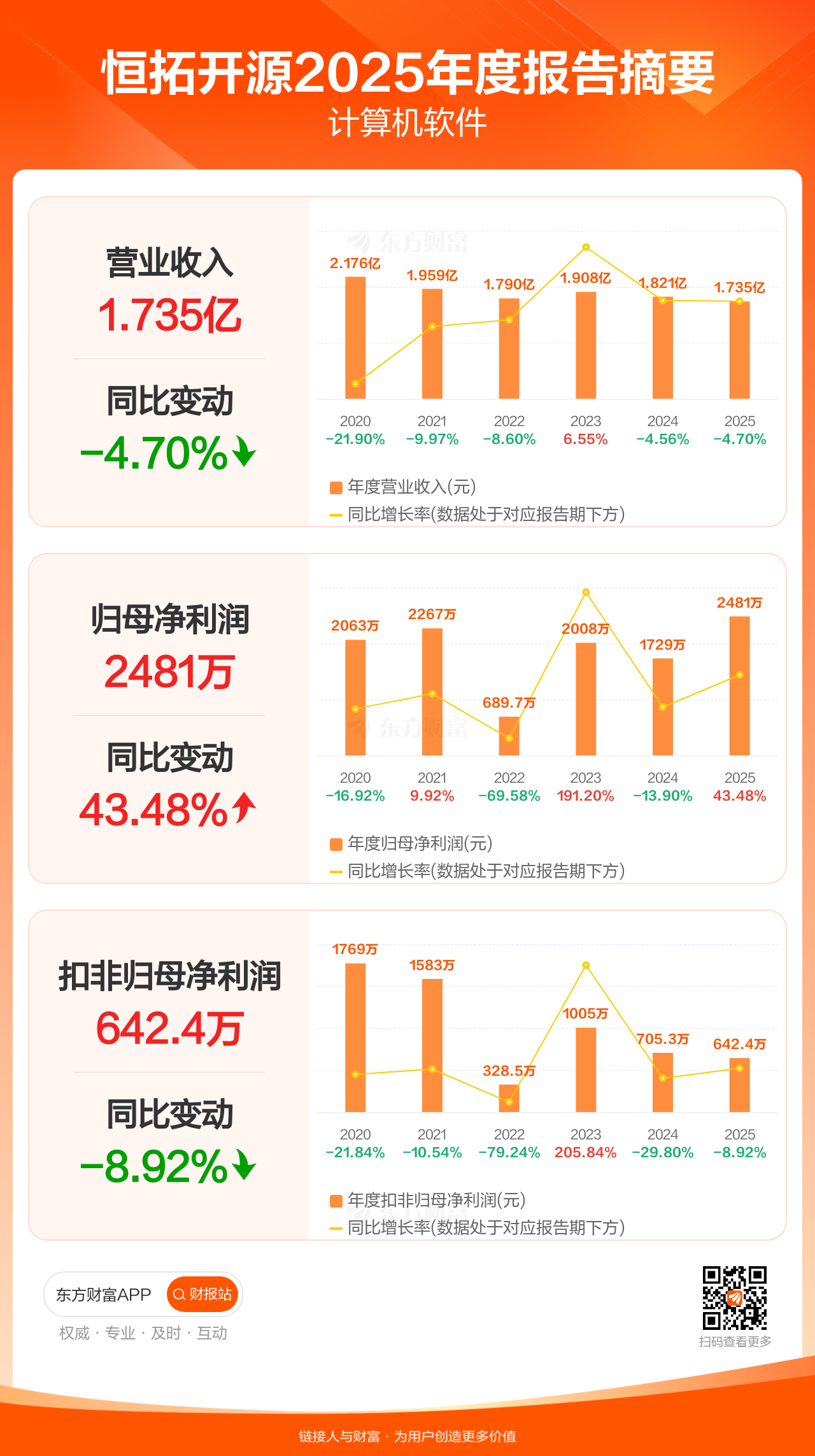 恒拓开源3月30日发布2025年年报显示,公司全年实现营业收入1.73亿元,同比下滑4.70%;归母净利润2481.06万元,同比增长43.48%;扣非归母净利润642.39万元,同比下滑8.92%。