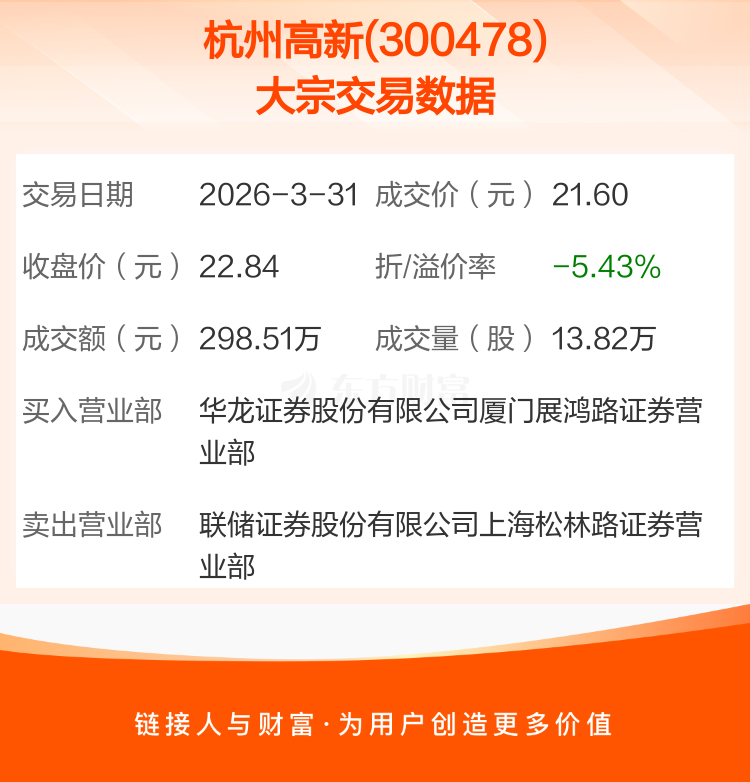 2026年3月31日,杭州高新发生1笔大宗交易,共成交13.82万股,成交金额298.51万元,占其流通市值比例为0.10%。