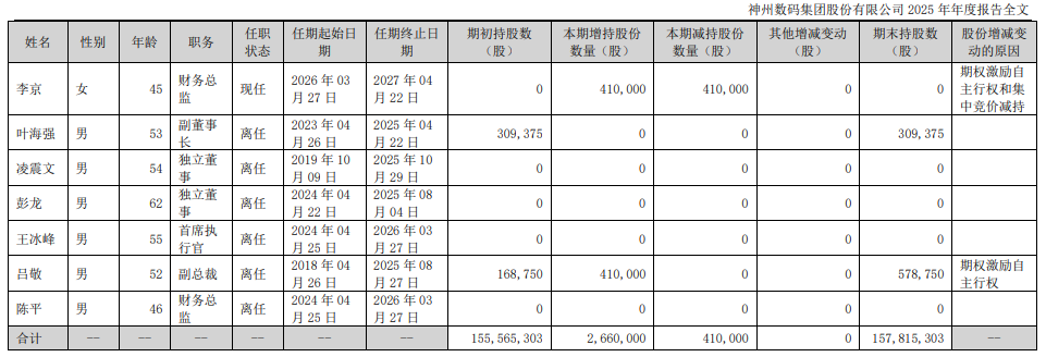 2025年4月,叶海强因公司整体工作安排辞任神州数码董事、副董事长、董事会专门委员会的职务;2025年7月,彭龙因接受调查无法正常履职,神州数码免去彭龙的独立董事职务以及其在董事会各专门委员会中担任的全部职务;2025年8月,吕敬因个人原因辞任神州数码副总裁职务;2025年9月,凌震文因连续担任独董达6年,辞任公司独立董事及董事会专门委员会的职务。
