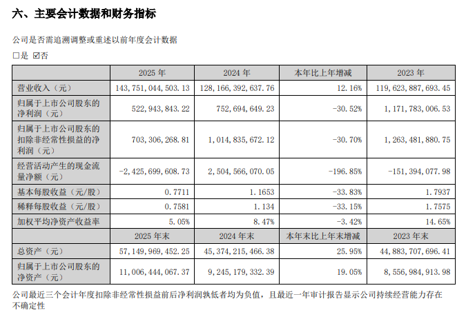 现金流方面,公司2025年经营性现金净额由正转负,为-24.26亿元,同比暴跌196.85%。