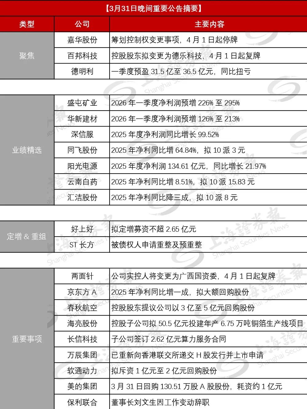 宁德时代:2026年3月31日,公司接到控股股东厦门瑞庭投资有限公司通知,其与上海交通大学教育发展基金会签订《上海交通大学“曾毓群教育基金”捐赠协议书》,拟向基金会无偿捐赠其持有的宁德时代500万股A股无限售流通股,占公司总股本的0.11%。前述捐赠股份产生的全部收益及所得资金将全部注入“曾毓群教育发展基金”,用于支持上海交通大学教育事业发展。