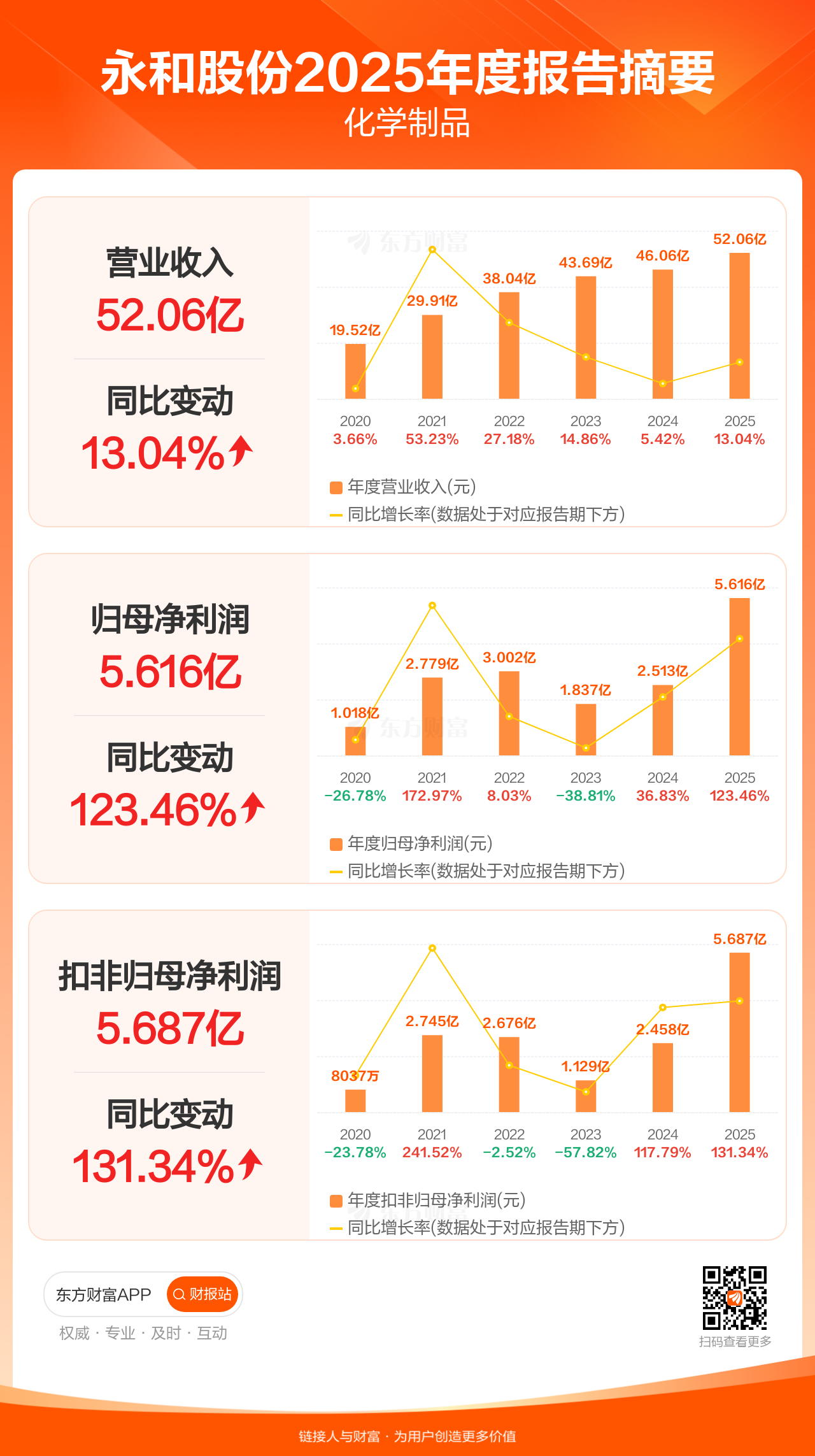 永和股份4月3日发布2025年年报显示,公司全年实现营业收入52.06亿元,同比增长13.04%;归母净利润5.62亿元,同比增长123.46%;扣非归母净利润5.69亿元,同比增长131.34%。