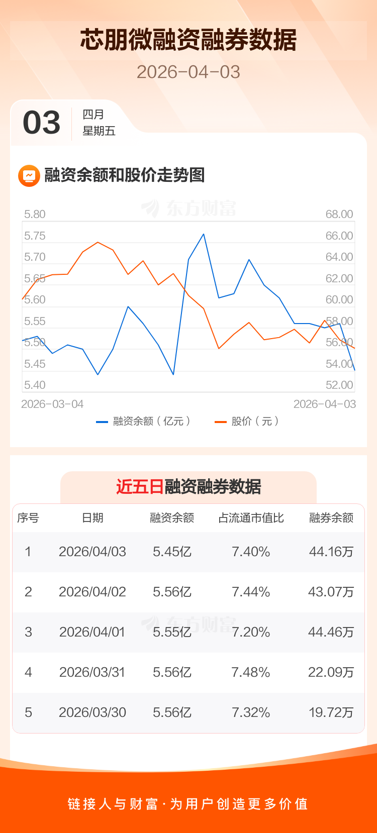 交易所最新数据显示,芯朋微于2026年4月3日获融资买入1329.34万元,融资偿还2388.25万元,当日融资净偿还1058.92万元。目前,该股融资余额5.45亿,占流通市值比例为7.40%。