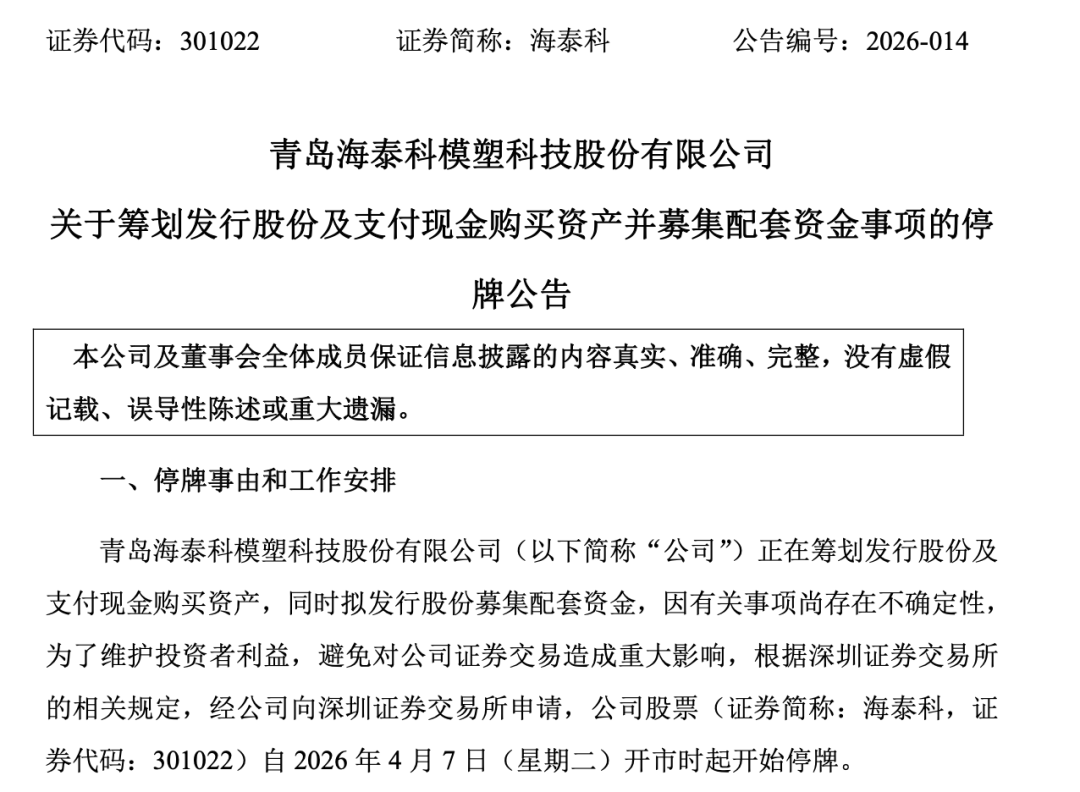 因相关事项存在不确定性,海泰科股票自4月7日开市起停牌。公司预计在不超过10个交易日的时间内披露本次交易方案,最晚将于4月21日披露相关信息并复牌。若本次交易终止,公司承诺自披露相关公告之日起至少1个月内不再筹划重大资产重组事项。