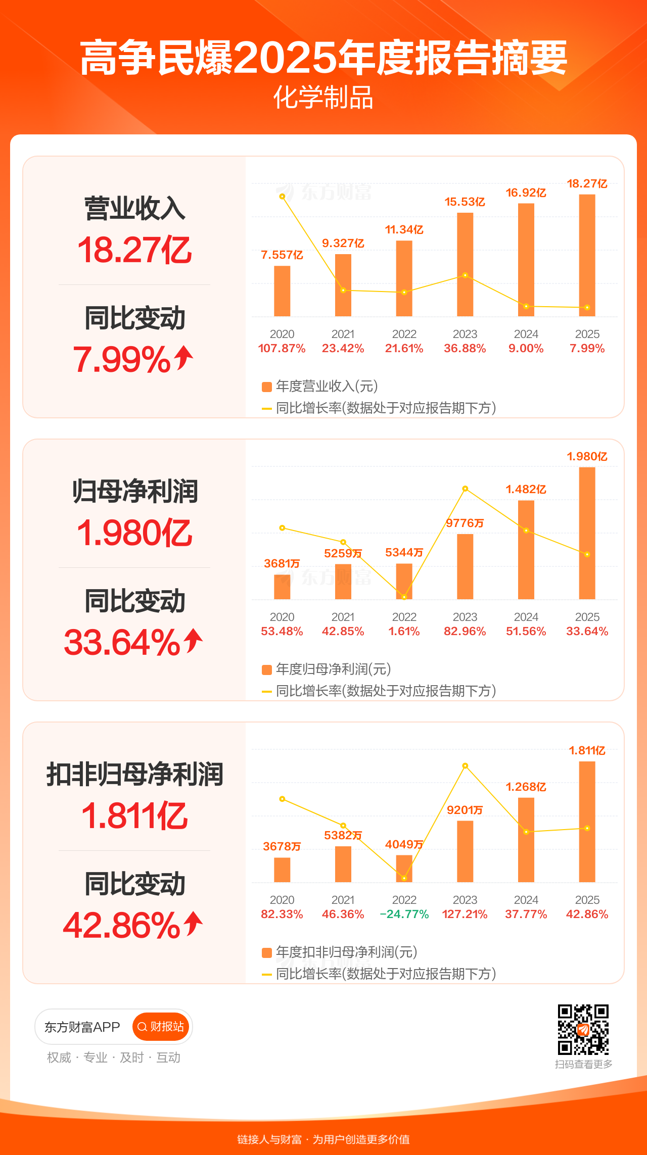 高争民爆4月8日发布2025年年报显示,公司全年实现营业收入18.27亿元,同比增长7.99%;归母净利润1.98亿元,同比增长33.64%;扣非归母净利润1.81亿元,同比增长42.86%。