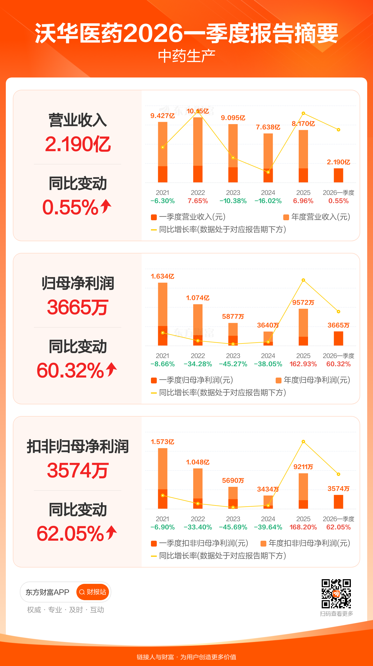 沃华医药4月8日发布2026年一季报显示,公司一季度实现营业收入2.19亿元,同比增长0.55%;归母净利润3664.87万元,同比增长60.32%;扣非归母净利润3574.37万元,同比增长62.05%。
