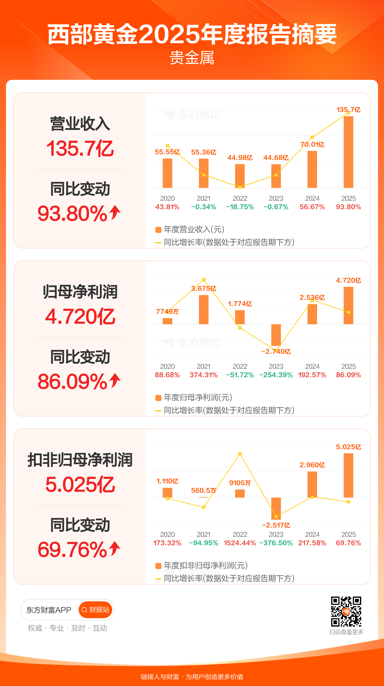 西部黄金4月8日发布2025年年报显示,公司全年实现营业收入135.67亿元,同比增长93.80%;归母净利润4.72亿元,同比增长86.09%;扣非归母净利润5.02亿元,同比增长69.76%。