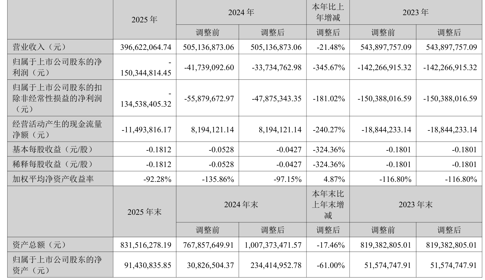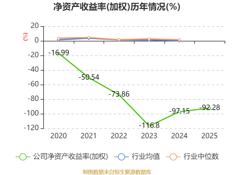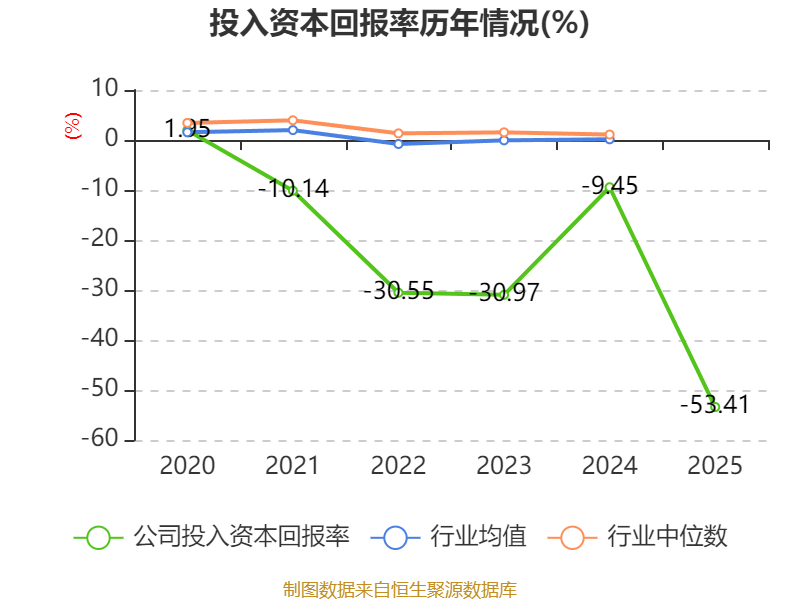 数据显示,2025年公司加权平均净资产收益率为-92.28%,较上年同期上升4.87个百分点。公司2025年投入资本回报率为-53.41%,较上年同期下降43.96个百分点。