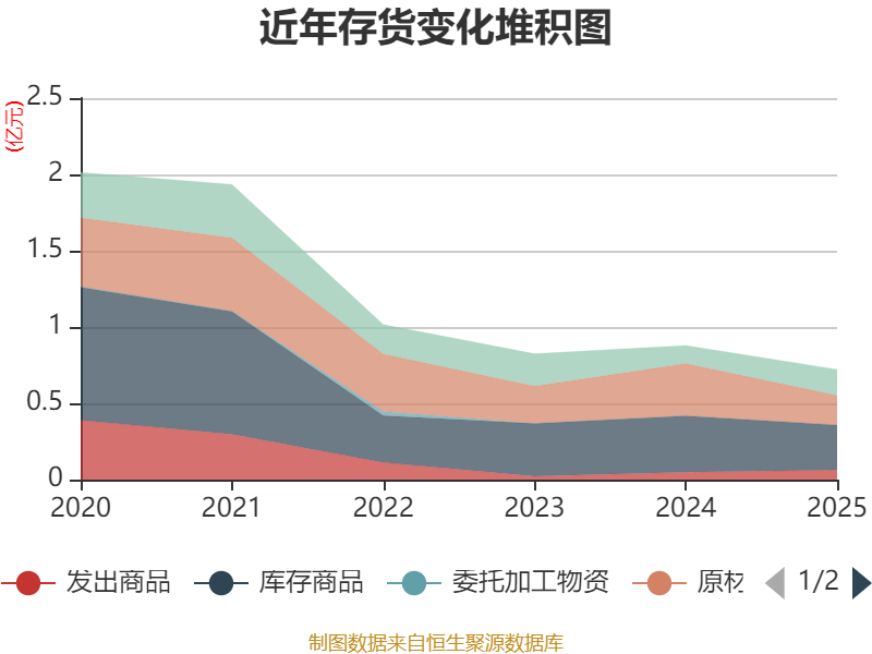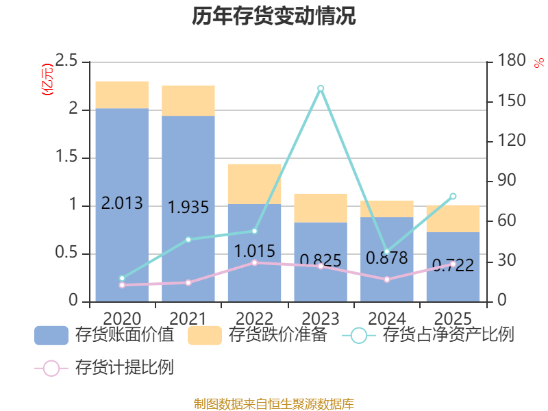 从存货变动来看,截至2025年末,公司存货账面价值为7216.31万元,占净资产的78.93%,较上年末减少1566.09万元。其中,存货跌价准备为2810.84万元,计提比例为28.03%。