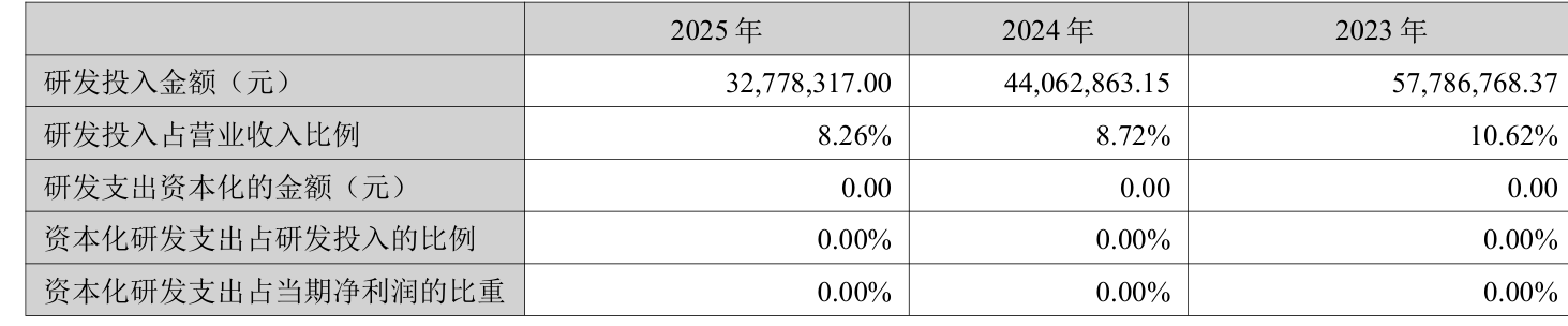 2025年全年,公司研发投入金额为3277.83万元,同比下降25.61%;研发投入占营业收入比例为8.26%,相比上年同期下降0.46个百分点。此外,公司全年研发投入资本化率为0%。