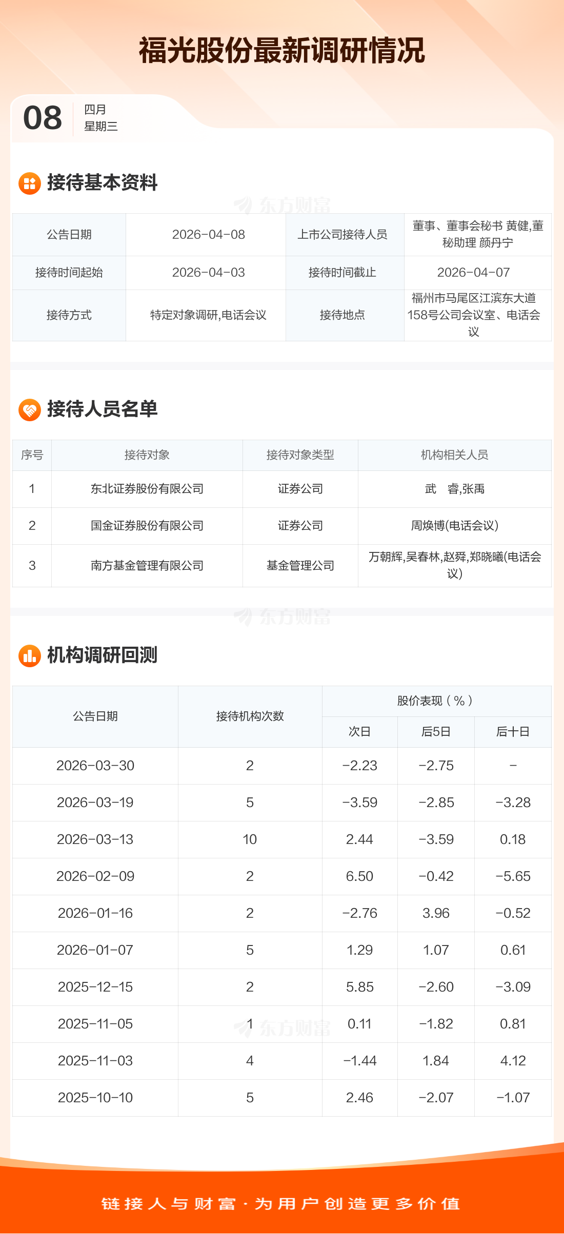 福光股份4月8日公告称,4月3日至4月7日接待东北证券股份有限公司等3家机构调研。接待人员包括董事、董事会秘书 黄健,董秘助理 颜丹宁。