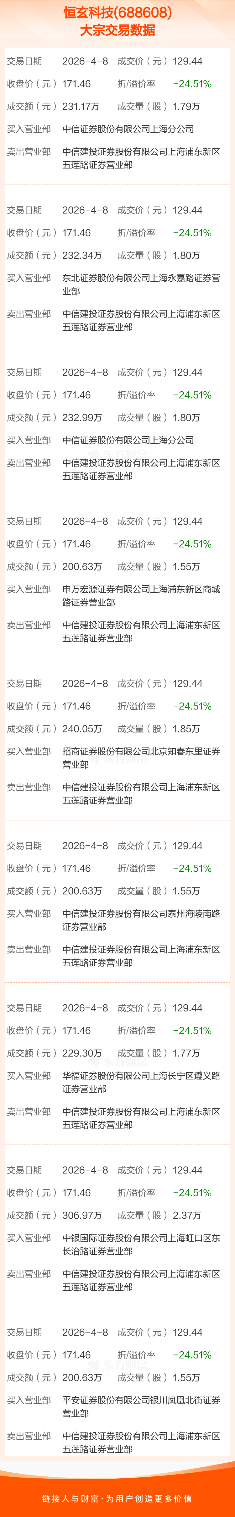 2026年4月8日,恒玄科技发生9笔大宗交易,共成交16.03万股,成交金额2074.71万元,占其流通市值比例为0.07%。