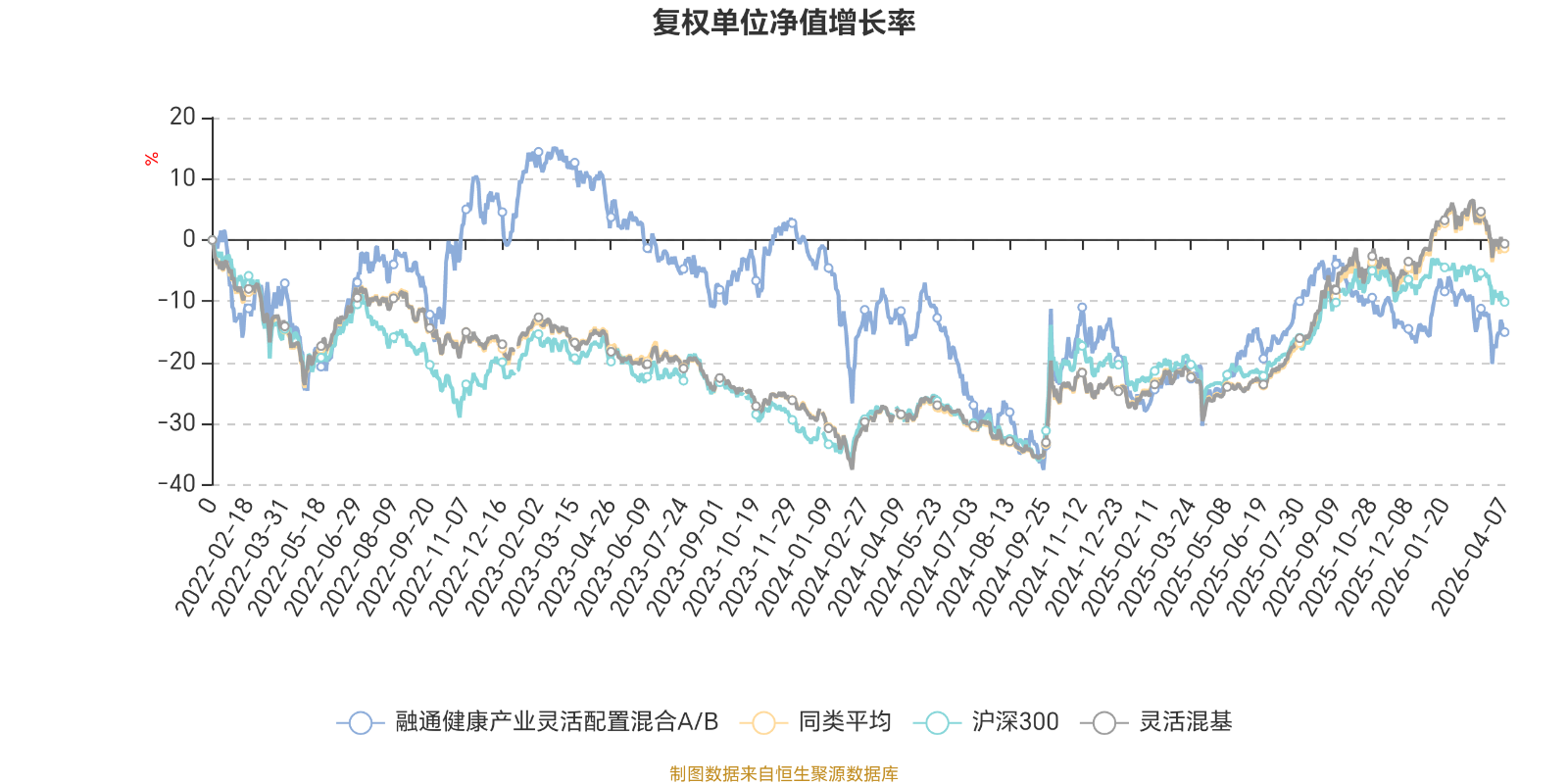截至4月7日,融通健康产业灵活配置混合A/B近三个月复权单位净值增长率为-5.03%,位于同类可比基金838/1287;近半年复权单位净值增长率为-7.10%,位于同类可比基金1037/1286;近一年复权单位净值增长率为22.01%,位于同类可比基金831/1286;近三年复权单位净值增长率为-22.85%,位于同类可比基金1215/1286。