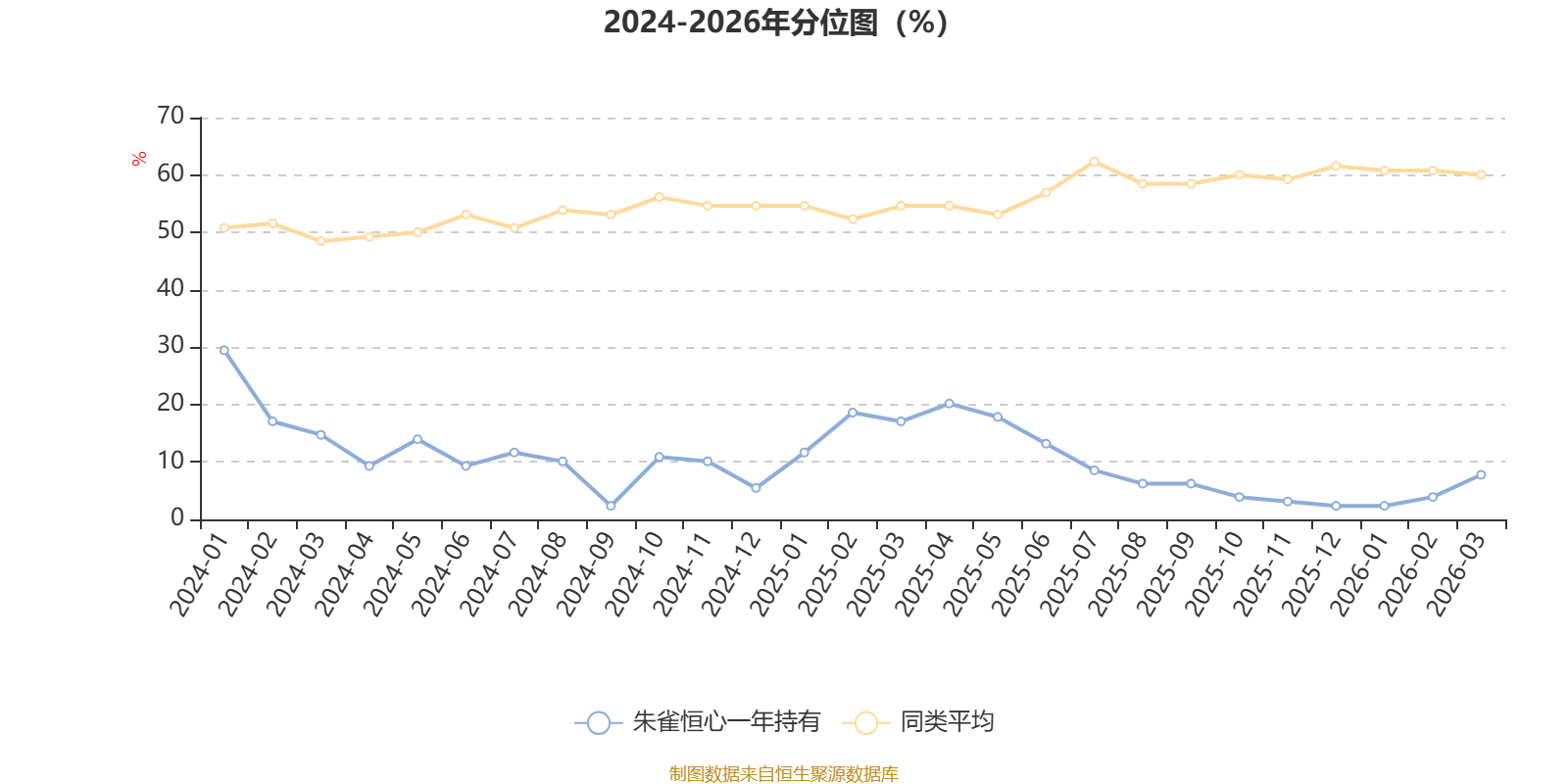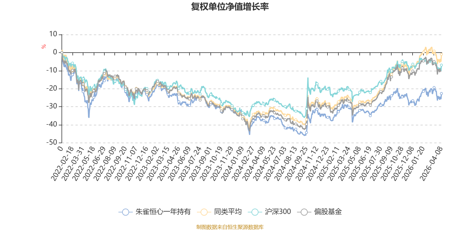 截至4月8日,朱雀恒心一年持有近三个月复权单位净值增长率为2.44%,位于同类可比基金32/130;近半年复权单位净值增长率为-3.32%,位于同类可比基金88/130;近一年复权单位净值增长率为25.54%,位于同类可比基金91/130;近三年复权单位净值增长率为0.40%,位于同类可比基金98/126。