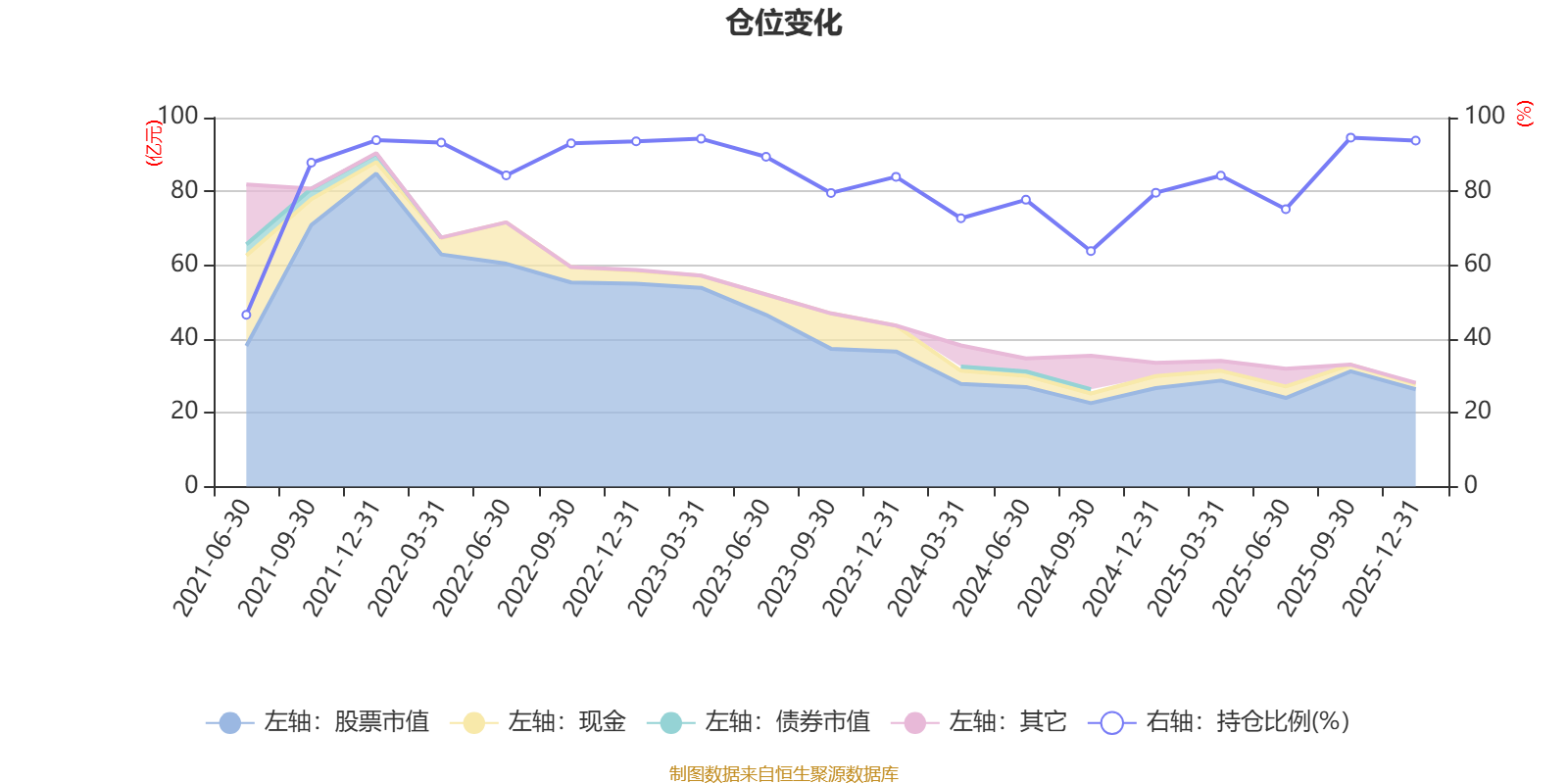 据定期报告数据统计,近三年平均股票仓位为82.4%,同类平均为86.17%。2025年三季度末基金达到94.58%的最高仓位,2021年上半年末最低,为46.55%。