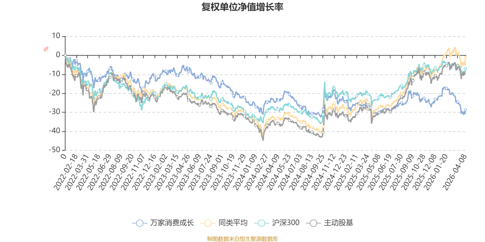 截至4月8日,万家消费成长近三个月复权单位净值增长率为-13.17%,位于同类可比基金165/167;近半年复权单位净值增长率为-10.05%,位于同类可比基金153/167;近一年复权单位净值增长率为3.60%,位于同类可比基金160/165;近三年复权单位净值增长率为-24.93%,位于同类可比基金153/157。