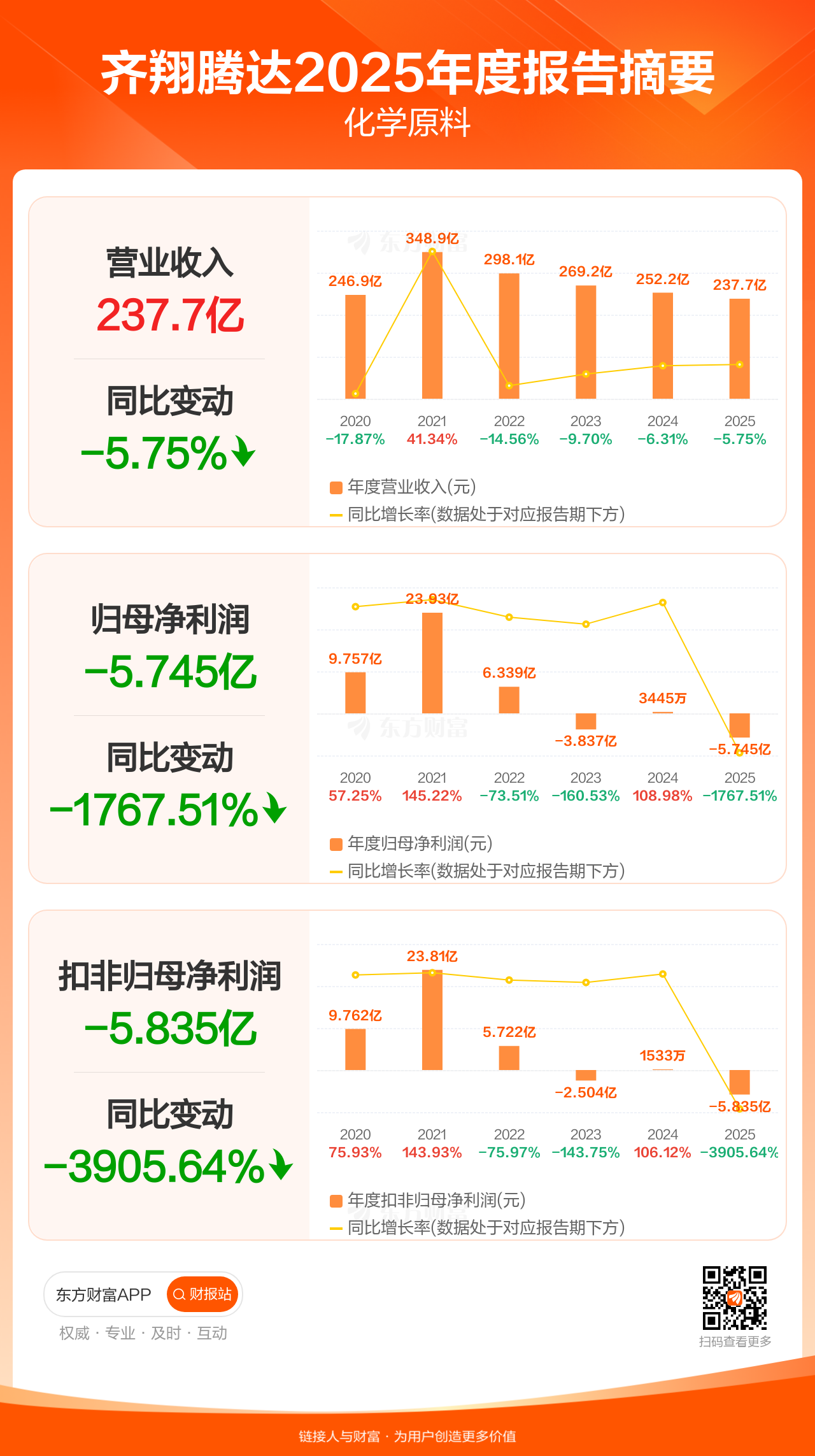 齐翔腾达4月10日发布2025年年报显示,公司全年实现营业收入237.70亿元,同比下滑5.75%;归母净利润-5.75亿元;扣非归母净利润-5.83亿元。