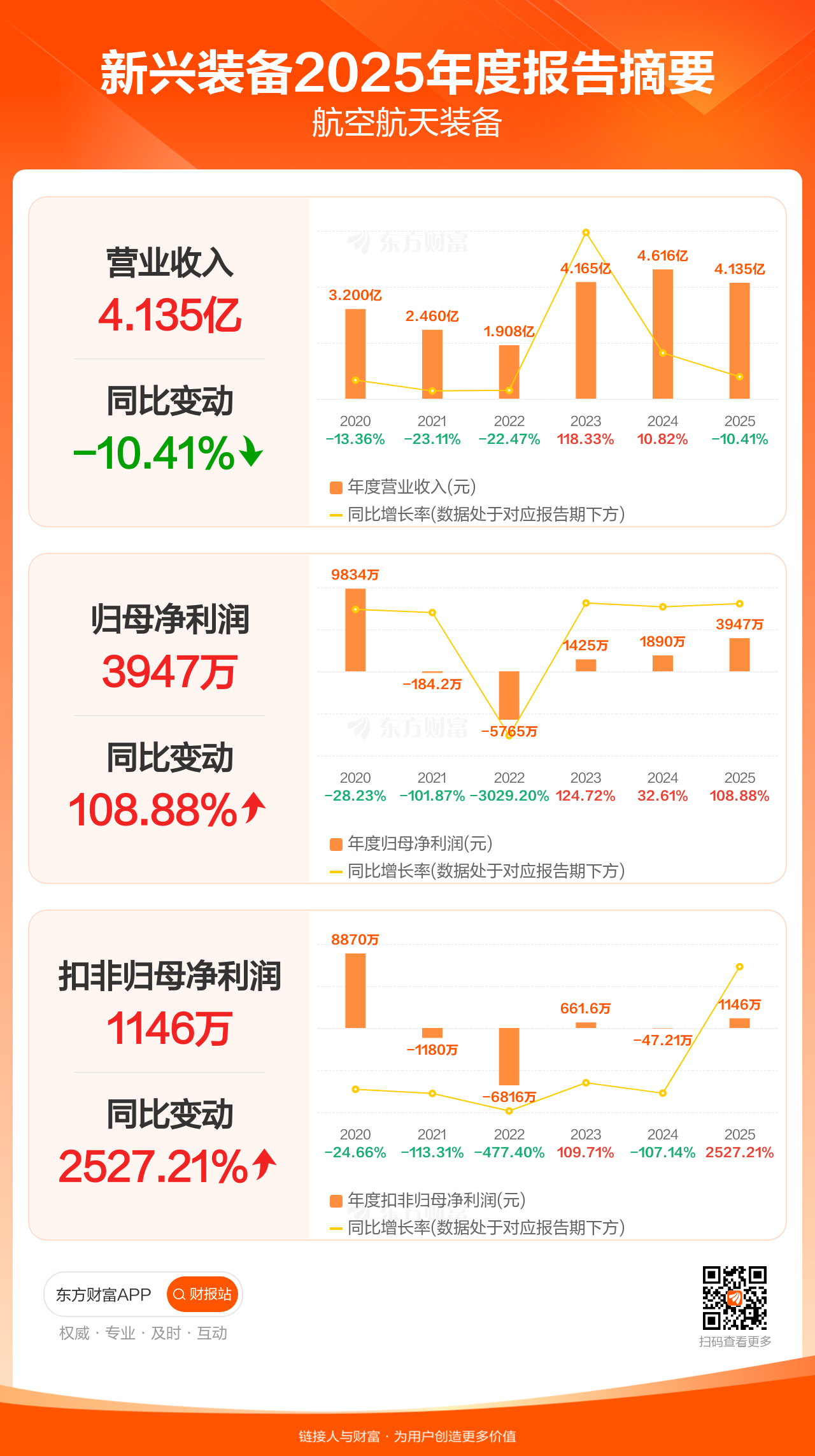 新兴装备4月10日发布2025年年报显示,公司全年实现营业收入4.14亿元,同比下滑10.41%;归母净利润3947.49万元,同比增长108.88%;扣非归母净利润1145.96万元,同比增长2527.21%。