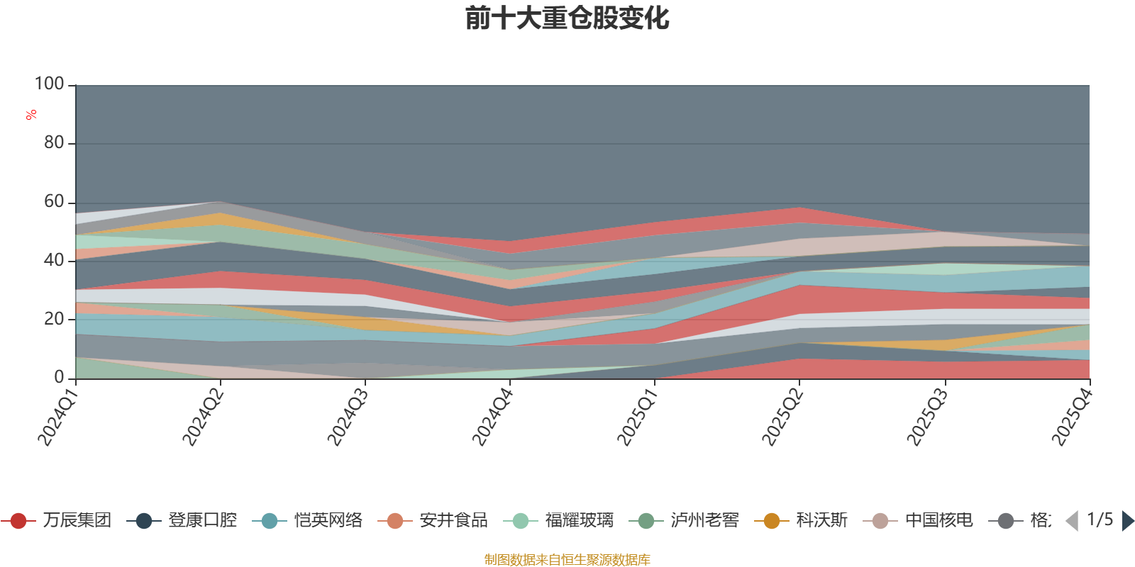 截至2025年末,基金十大重仓股分别是山西汾酒、贵州茅台、万辰集团、东鹏饮料、泸州老窖、稳健医疗、中宠股份、若羽臣、恺英网络、安井食品。