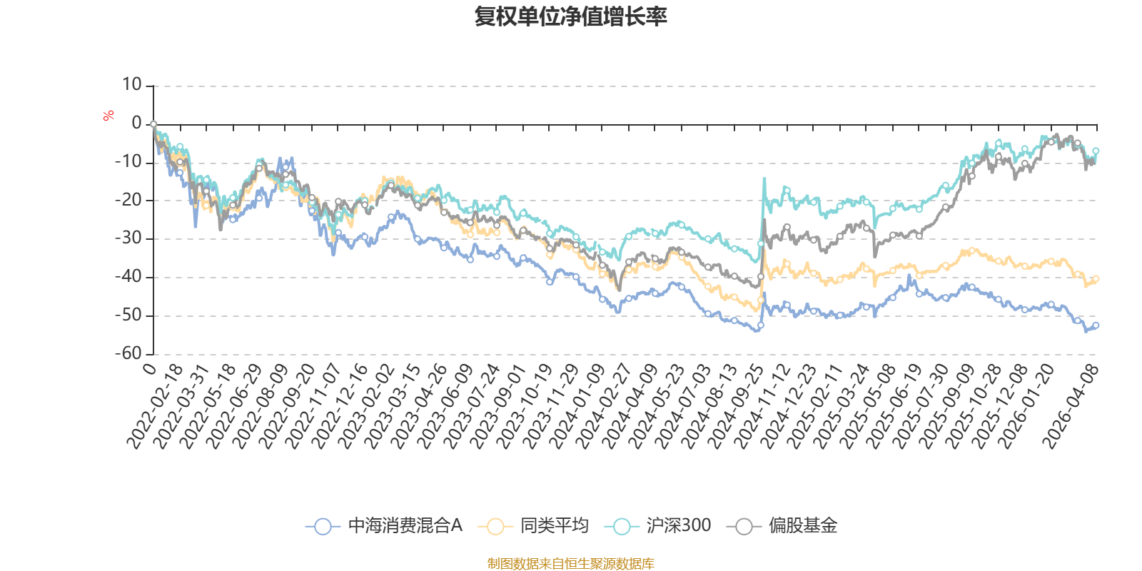 截至4月8日,中海消费混合A近三个月复权单位净值增长率为-9.73%,位于同类可比基金69/85;近半年复权单位净值增长率为-15.26%,位于同类可比基金64/85;近一年复权单位净值增长率为-6.22%,位于同类可比基金68/85;近三年复权单位净值增长率为-32.35%,位于同类可比基金64/76。