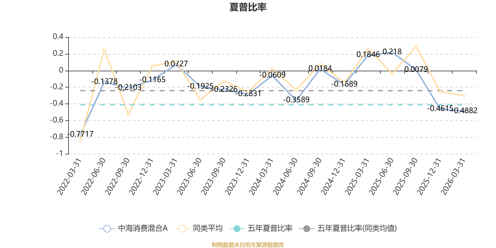 截至3月31日,基金近三年夏普比率为-0.3982,位于同类可比基金71/75。