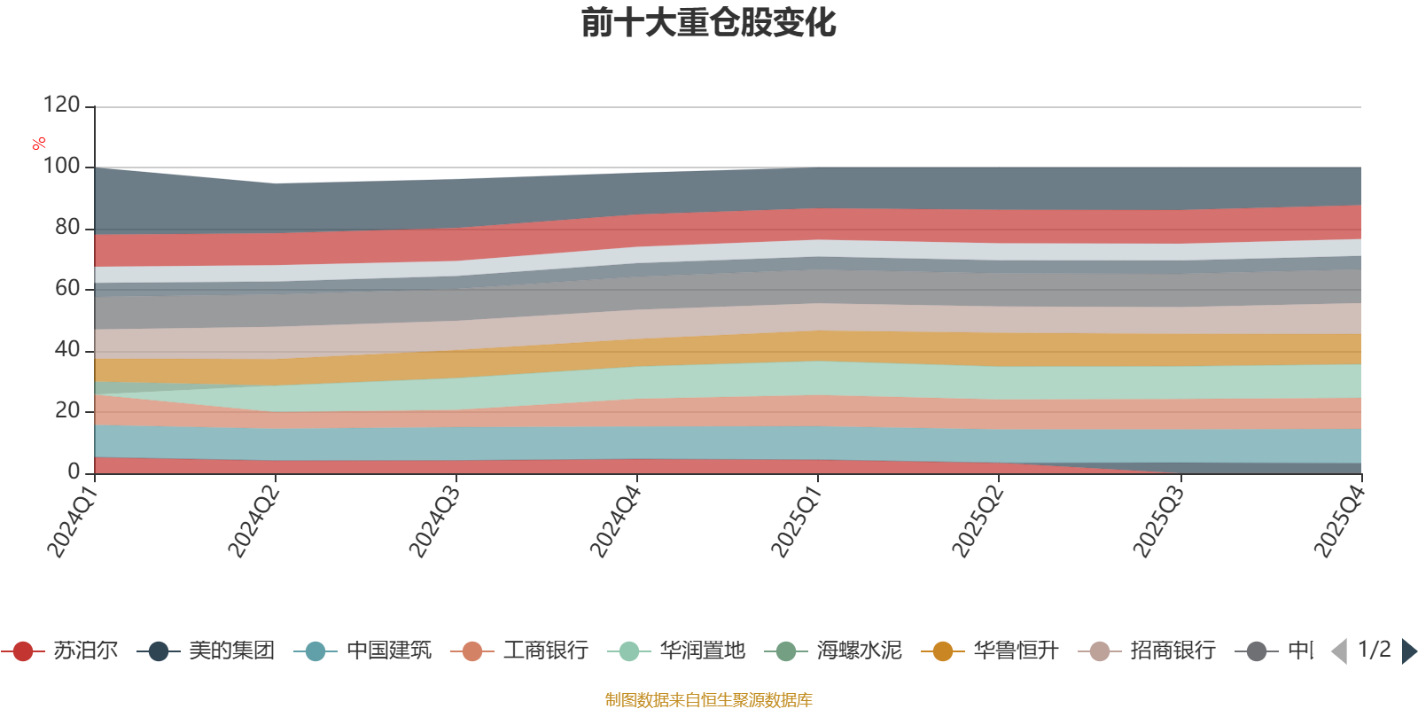 该基金持股集中度较高,且持股标的较为稳定,近2年前十大重仓股集中度长期超过60%。截至2025年末,基金十大重仓股分别是中国建筑、中国海外发展、太阳纸业、华润置地、工商银行、招商银行、华鲁恒升、中国中铁、建发股份、美的集团。