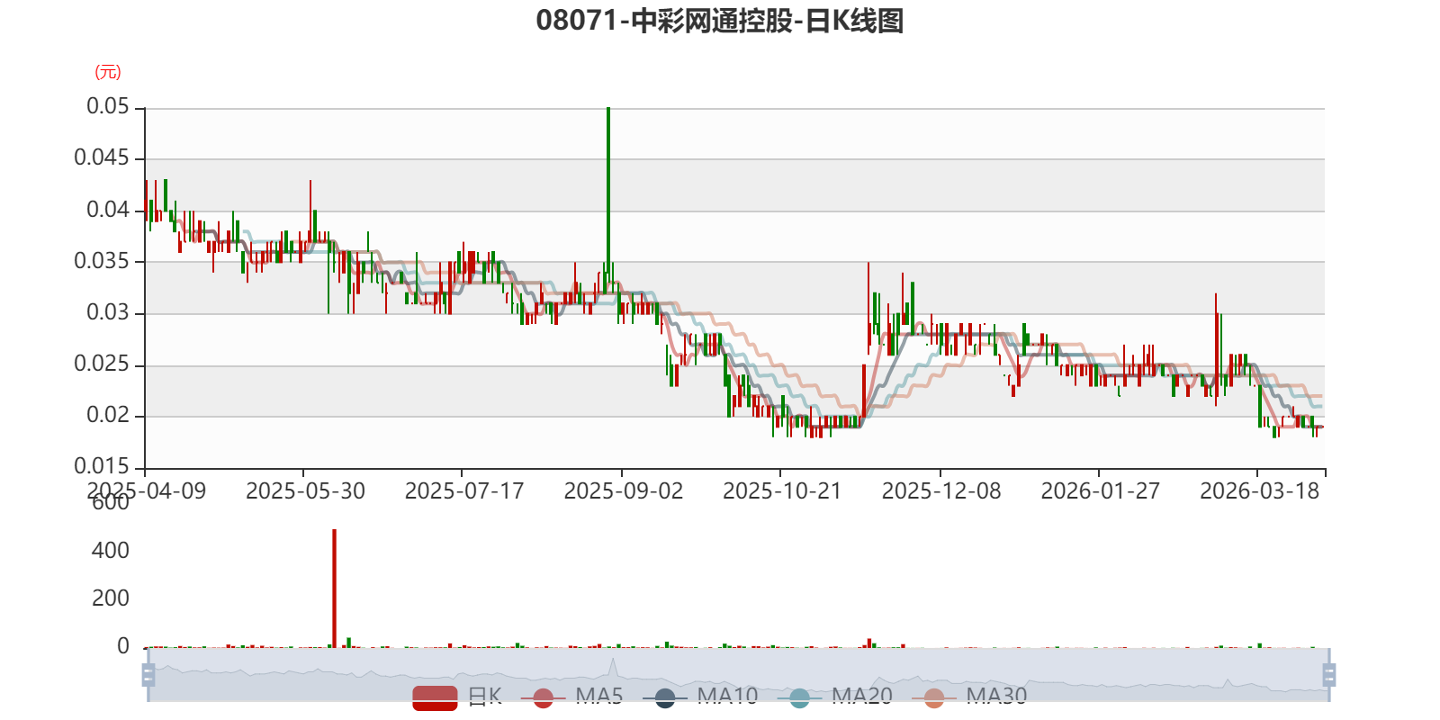 中证智能财讯中彩网通控股(08071)4月9日披露2025年度报告。报告期内,公司实现营业收入3672.6万港元,同比增长36.44%;归母净利润亏损495.6万港元,上年同期亏损759.8万港元;经营活动产生的现金流量净额为68.5万港元,上年同期为-904.6万港元;据报告显示,中彩网通控股基本每股收益为-0.0011港元,平均净资产收益率为-59.65%。
