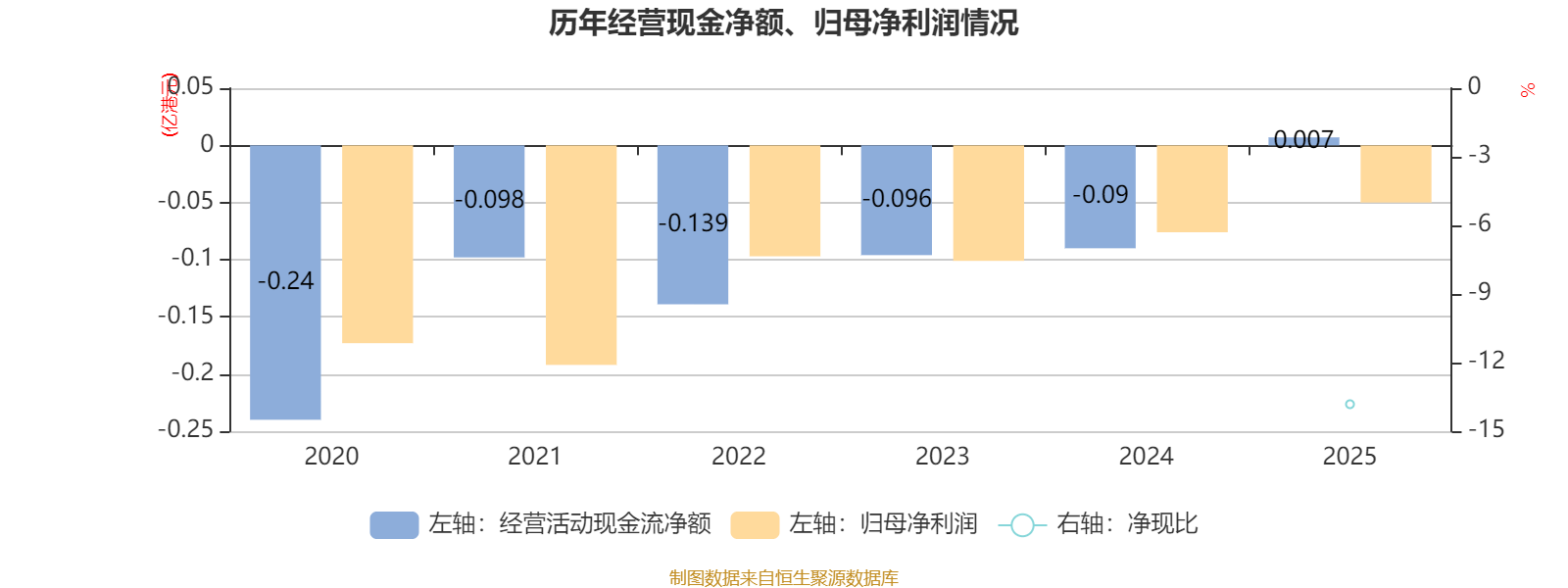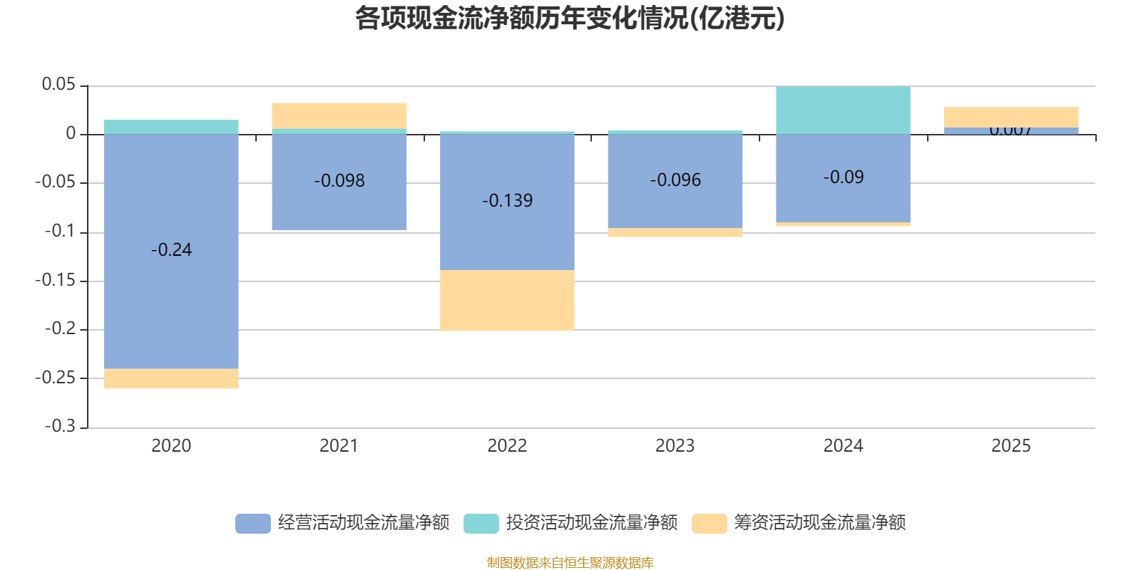 2025年,公司经营活动现金流净额为68.5万港元,同比增加973.1万港元;筹资活动现金流净额210.4万港元,同比增加254.3万港元;投资活动现金流净额-2.8万港元,上年同期为493.4万港元。