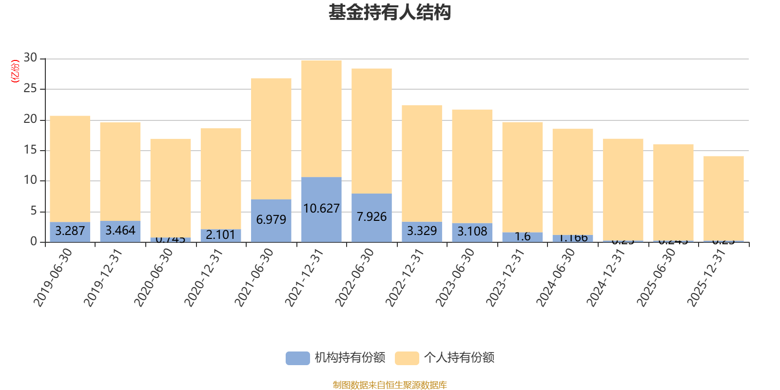 截至2025年12月31日,基金持有人共计7.36万户,合计持有14.03亿份。其中管理人员工持有191.03万份,占比0.14%,机构持有份额占比1.64%,个人投资者占比98.36%。