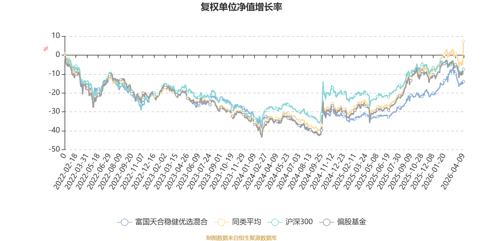 截至4月9日,富国天合稳健优选混合近三个月复权单位净值增长率为1.62%,位于同类可比基金38/130;近半年复权单位净值增长率为7.44%,位于同类可比基金28/130;近一年复权单位净值增长率为30.53%,位于同类可比基金78/130;近三年复权单位净值增长率为5.29%,位于同类可比基金91/126。