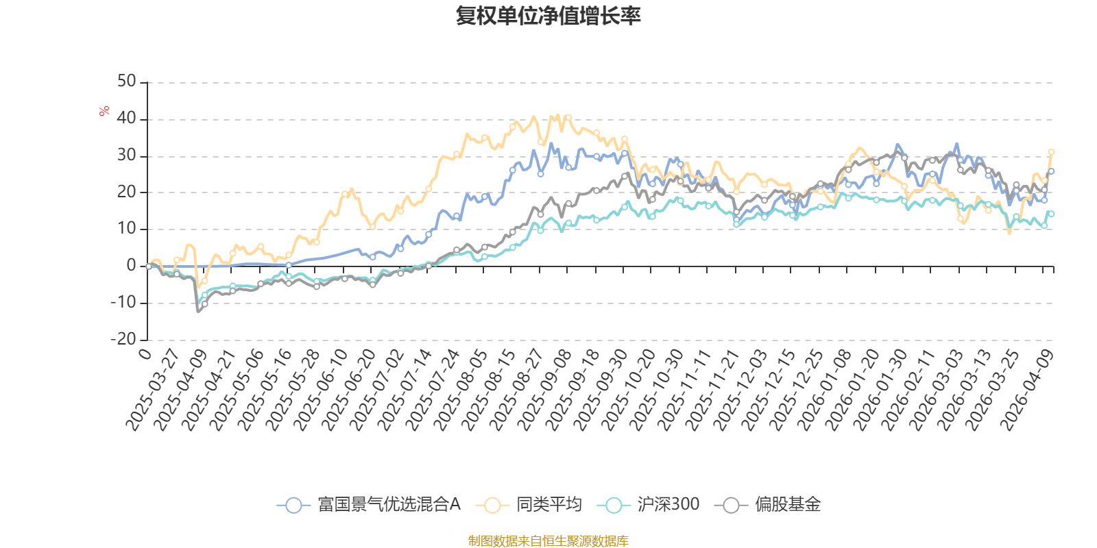 截至4月9日,富国景气优选混合A近三个月复权单位净值增长率为2.54%,位于同类可比基金7/106;近半年复权单位净值增长率为-4.03%,位于同类可比基金17/106;近一年复权单位净值增长率为25.85%,位于同类可比基金56/104。