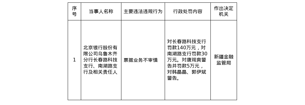 针对上述违法违规行为,新疆金融监管局对北京银行股份有限公司乌鲁木齐分行长春路科技支行罚款140万元;对南湖路支行罚款30万元;对唐观爽警告并处罚款5万元;对韩晶晶、郭伊斌警告。