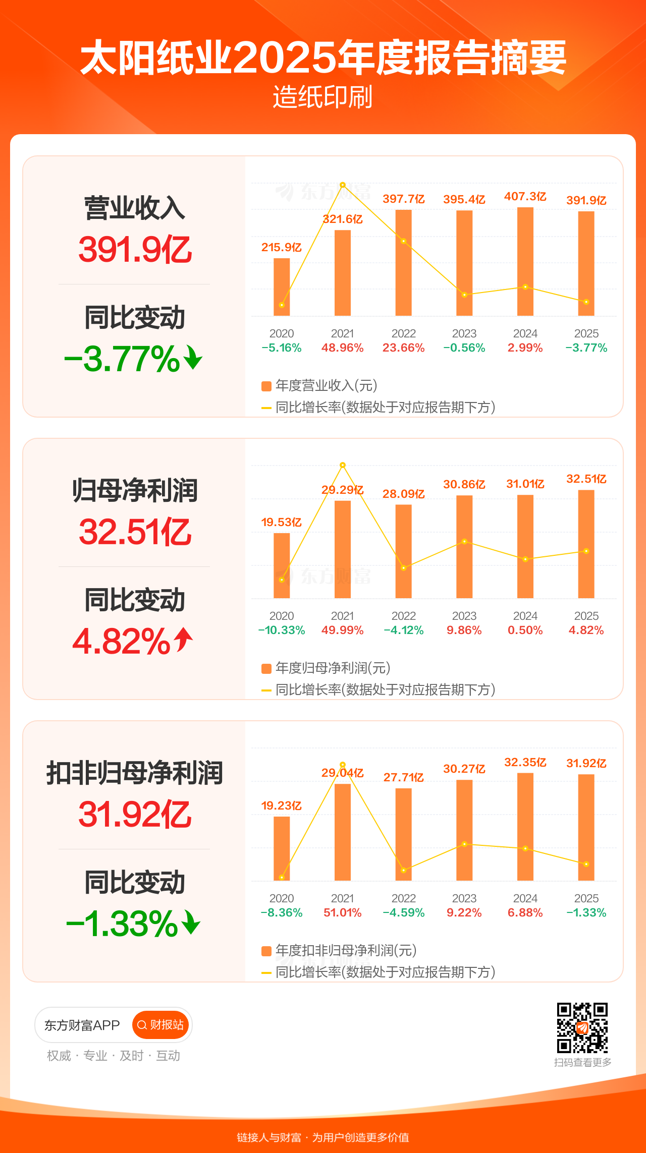 太阳纸业4月11日发布2025年年报显示,公司全年实现营业收入391.92亿元,同比下滑3.77%;归母净利润32.51亿元,同比增长4.82%;扣非归母净利润31.92亿元,同比下滑1.33%。