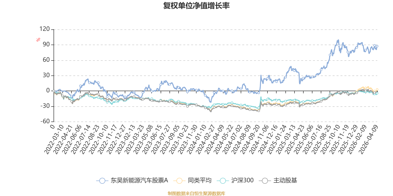 截至4月9日,东吴新能源汽车股票A近三个月复权单位净值增长率为-1.86%,位于同类可比基金85/167;近半年复权单位净值增长率为-5.65%,位于同类可比基金128/167;近一年复权单位净值增长率为63.13%,位于同类可比基金32/165;近三年复权单位净值增长率为74.11%,位于同类可比基金8/157。