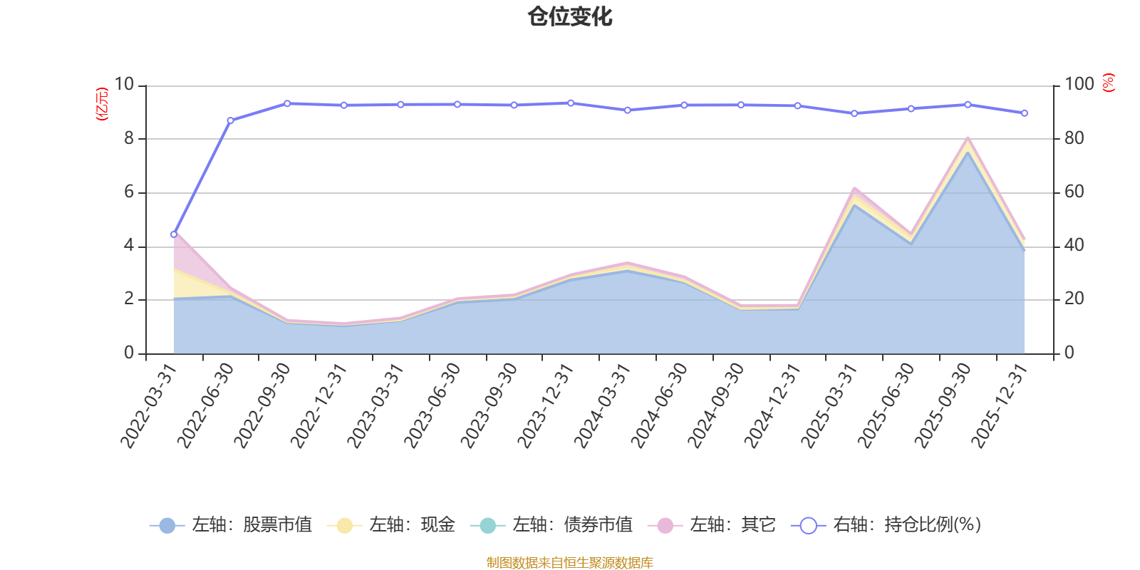 据定期报告数据统计,近三年平均股票仓位为92.03%,同类平均为88.27%。2023年末基金达到93.46%的最高仓位,2022年一季度末最低,为44.49%。