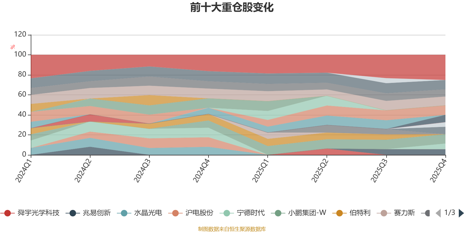 该基金持股集中度较高,近2年前十大重仓股集中度长期超过60%。截至2025年末,基金十大重仓股分别是德赛西威、小鹏集团-W、豪威集团、立讯精密、地平线机器人-W、天赐材料、拓普集团、宁德时代、兆易创新、赣锋锂业。