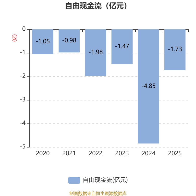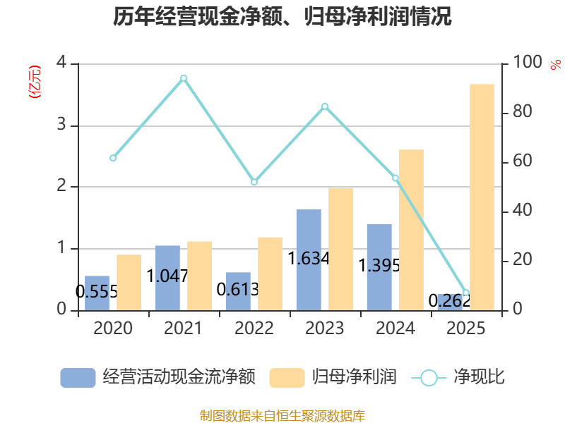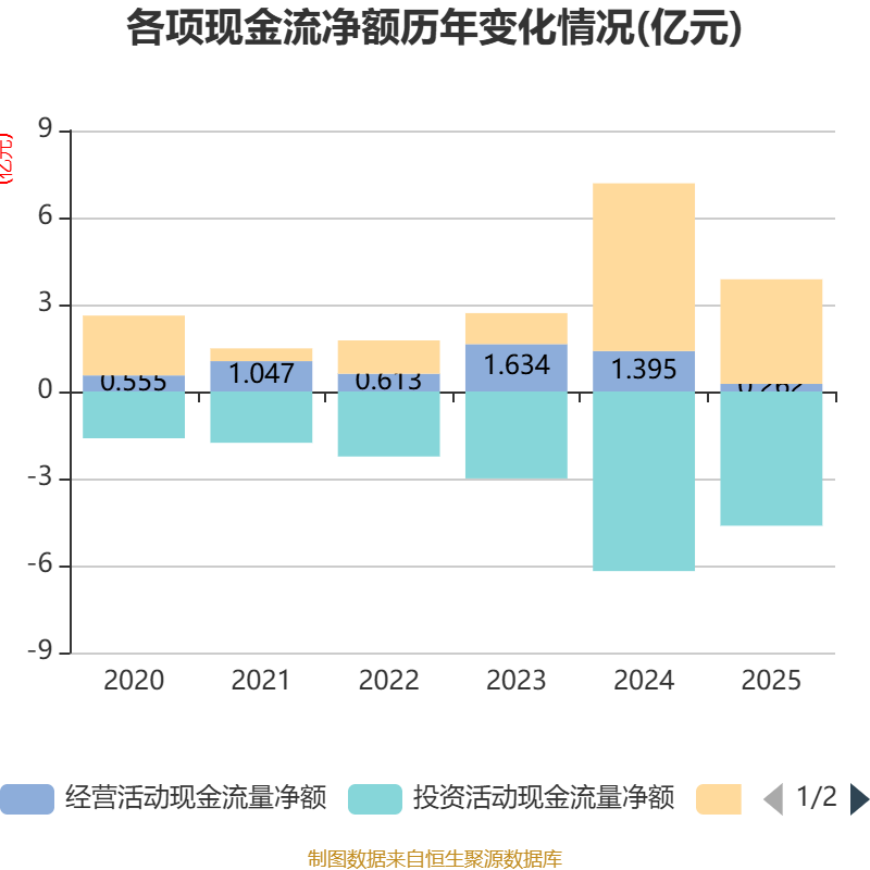 截至2025年,公司经营活动现金流净额为2619.71万元,同比下降81.22%;筹资活动现金流净额3.61亿元,同比减少2.18亿元;投资活动现金流净额-4.63亿元,上年同期为-6.19亿元。