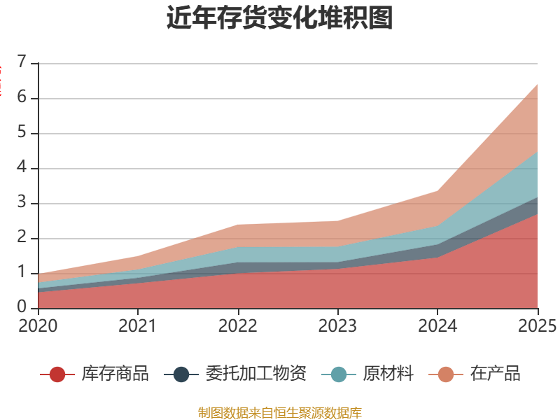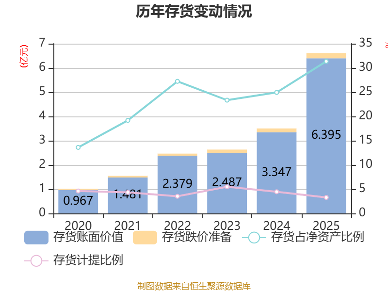 从存货变动来看,截至2025年末,公司存货账面价值为6.39亿元,占净资产的31.35%,较上年末增加3.05亿元。其中,存货跌价准备为2175.12万元,计提比例为3.29%。