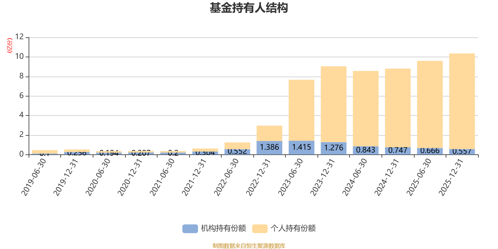 截至2025年12月31日,基金持有人共计21.66万户,合计持有10.35亿份。其中管理人员工持有537.09万份,占比0.52%,机构持有份额占比5.38%,个人投资者占比94.62%。