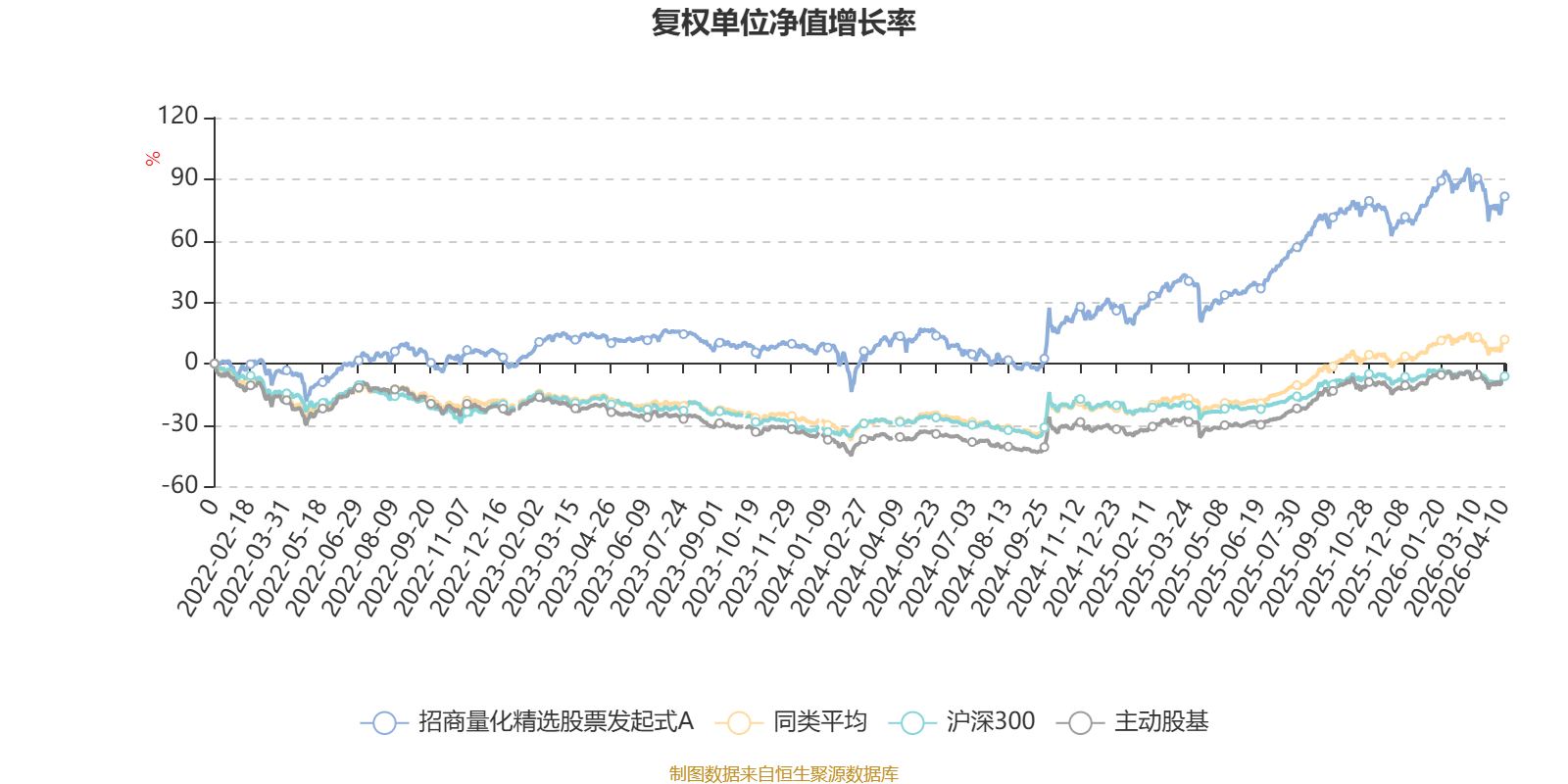 截至4月10日,招商量化精选股票发起式A近三个月复权单位净值增长率为-1.45%,位于同类可比基金39/58;近半年复权单位净值增长率为1.84%,位于同类可比基金38/58;近一年复权单位净值增长率为45.20%,位于同类可比基金24/57;近三年复权单位净值增长率为61.20%,位于同类可比基金9/57。