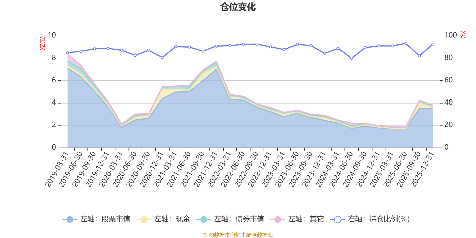 据定期报告数据统计,近三年平均股票仓位为88.52%,同类平均为88.27%。2025年上半年末基金达到93.14%的最高仓位,2024年上半年末最低,为79.84%。