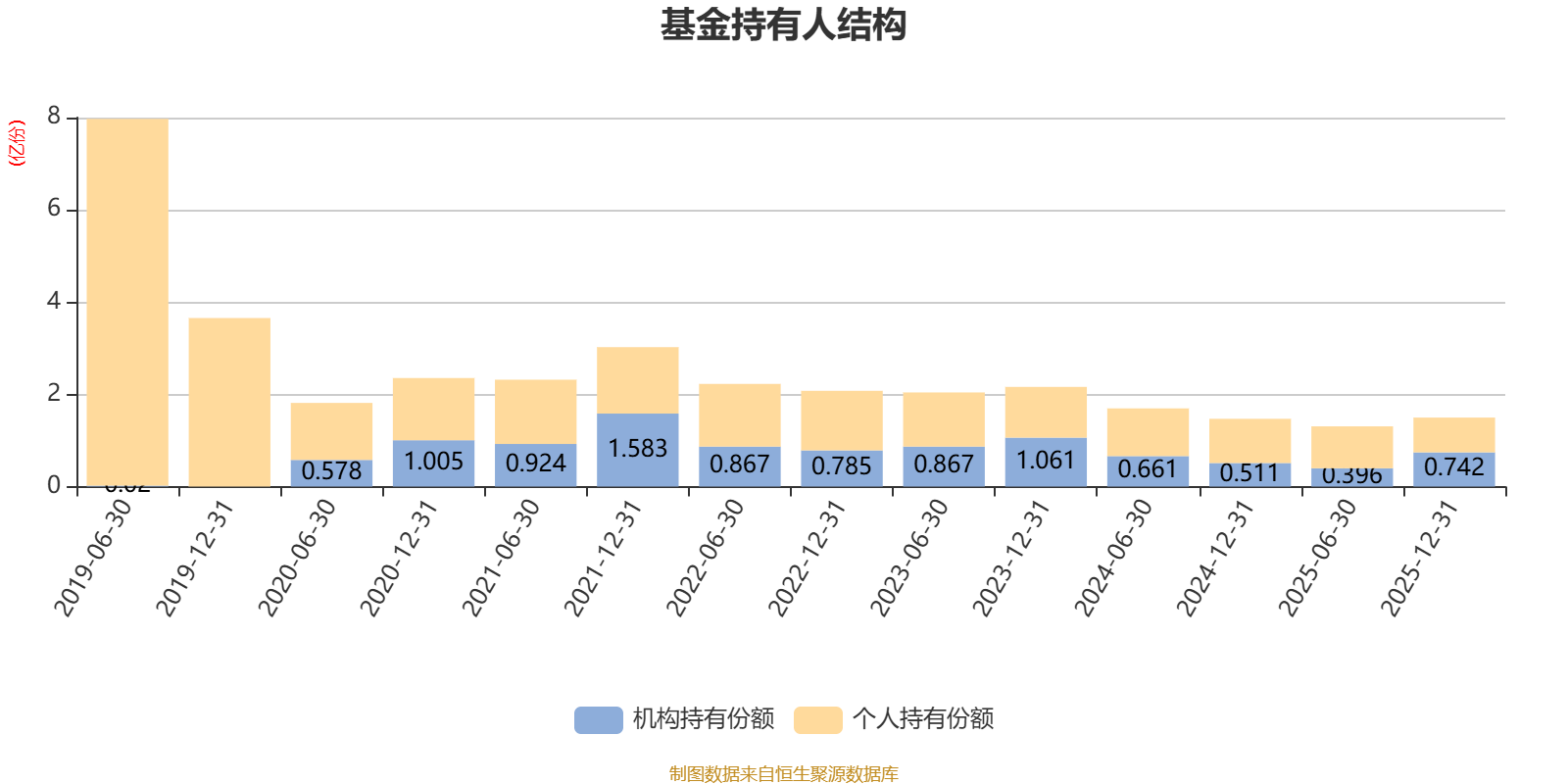 截至2025年12月31日,基金持有人共计5542户,合计持有1.5亿份。其中管理人员工持有95.26万份,占比0.64%,机构持有份额占比49.60%,个人投资者占比50.40%。