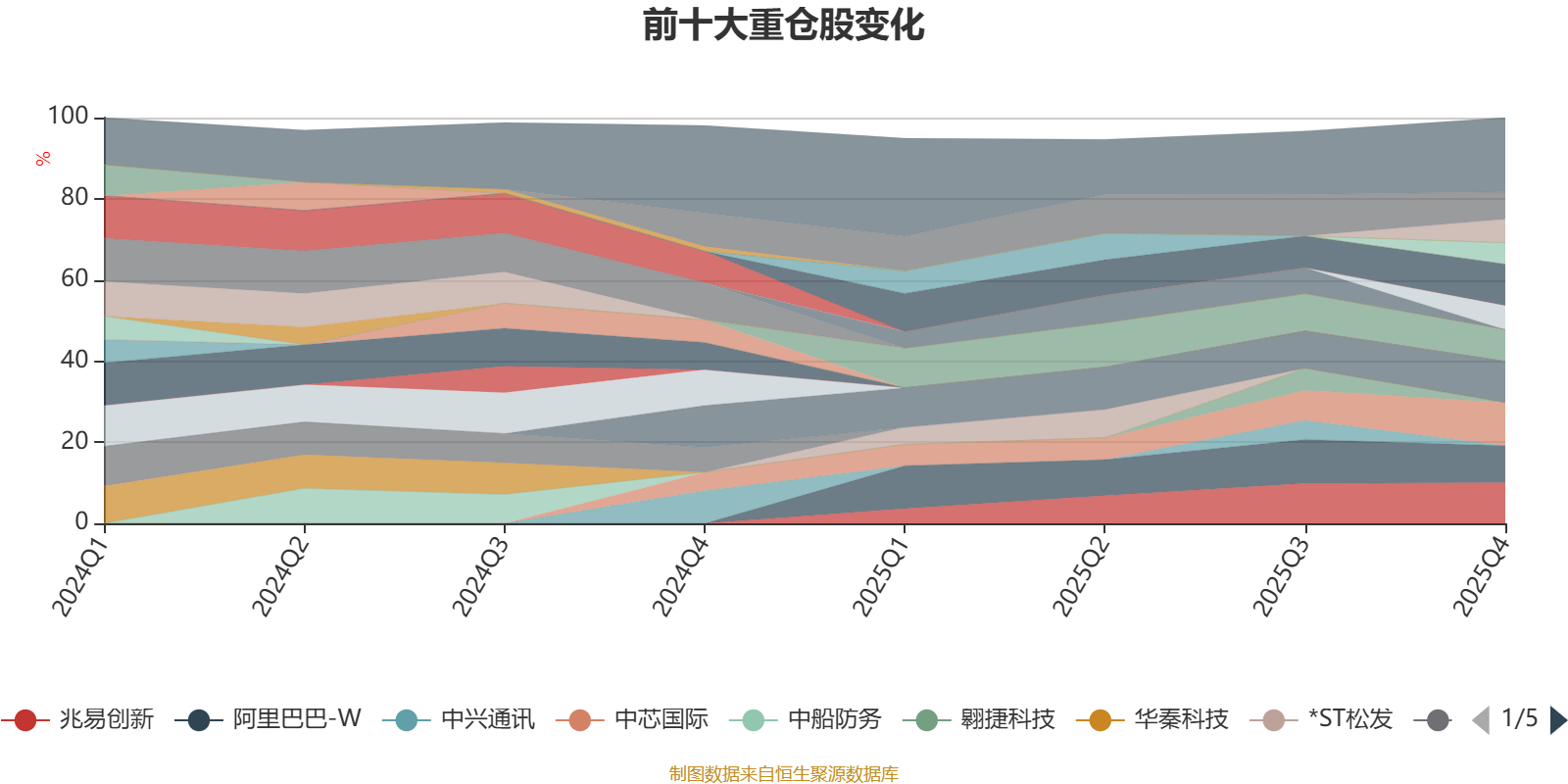 该基金持股集中度较高,近2年前十大重仓股集中度长期超过60%。截至2025年末,基金十大重仓股分别是中芯国际、腾讯控股、寒武纪、兆易创新、阿里巴巴-W、小米集团-W、海光信息、腾景科技、中富电路、中际旭创。
